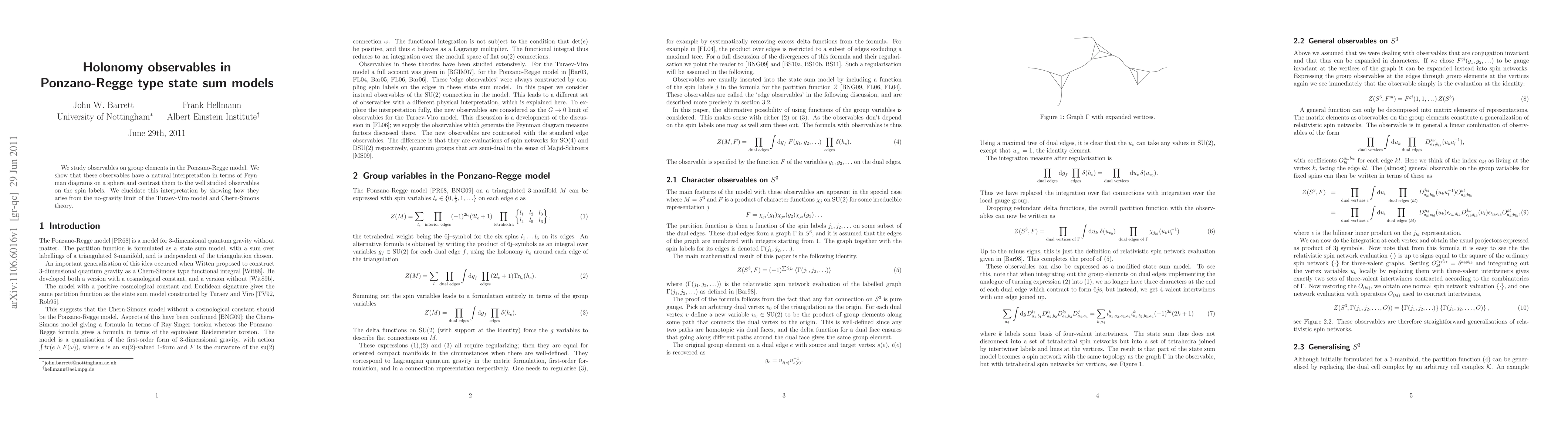This paper investigates holonomy observables in the Ponzano-Regge state sum model, demonstrating their interpretation in terms of Feynman diagrams on a sphere and contrasting them with traditional spin label observables. It connects these new observables to the no-gravity limit of the Turaev-Viro model and Chern-Simons theory.