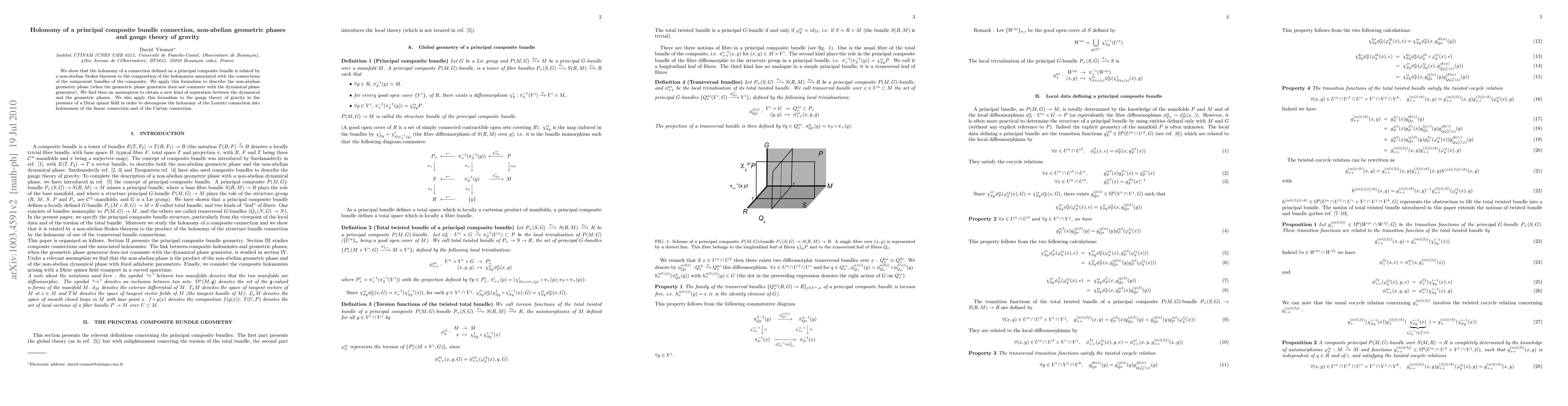This paper explores the holonomy of connections on principal composite bundles, establishing a non-abelian Stokes theorem linking the holonomy of the composite bundle to its component bundles. It applies this to describe non-abelian geometric phases and proposes a new separation between dynamical and geometric phases, also extending the formalism to gauge theory of gravity involving Dirac spinor fields.