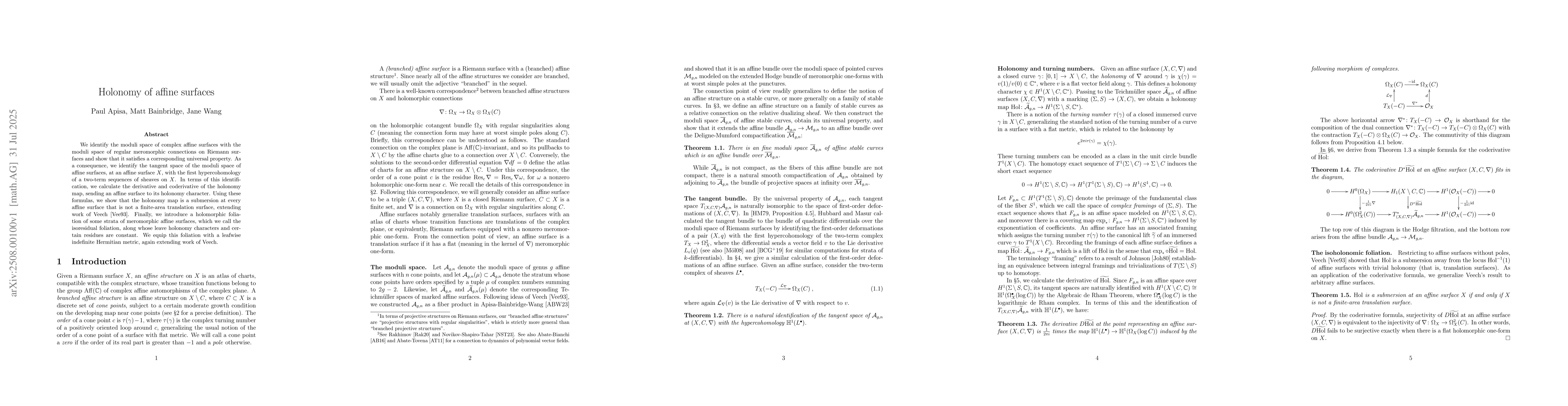 We identify the moduli space of complex affine surfaces with the moduli space of regular meromorphic connections on Riemann surfaces and show that it satisfies a corresponding universal property. As a consequence, we identify the tangent space of the moduli space of affine surfaces, at an affine surface X, with the first hypercohomology of a two-term sequences of sheaves on X. In terms of this identification, we calculate the derivative and coderivative of the holonomy map, sending an affine surface to its holonomy character. Using these formulas, we show that the holonomy map is a submersion at every affine surface that is not a finite-area translation surface, extending work of Veech. Finally, we introduce a holomorphic foliation of some strata of meromorphic affine surfaces, which we call the isoresidual foliation, along whose leave holonomy characters and certain residues are constant. We equip this foliation with a leafwise indefinite Hermitian metric, again extending work of Veech.