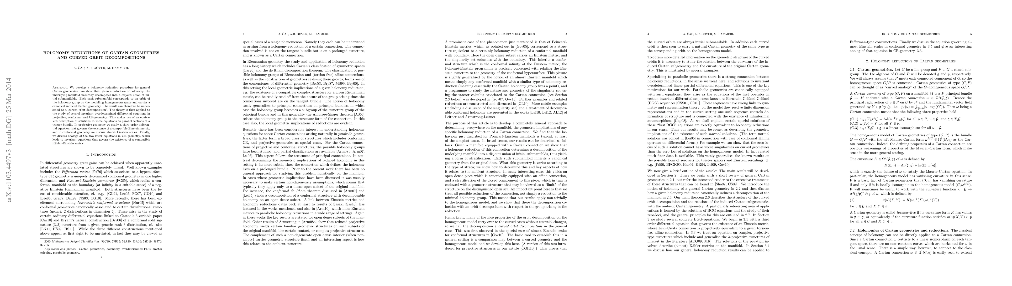 Researchers develop a method to decompose Cartan geometries into disjoint submanifolds based on holonomy reductions, with applications to solving invariant overdetermined differential equations in projective, conformal, and CR-geometry.