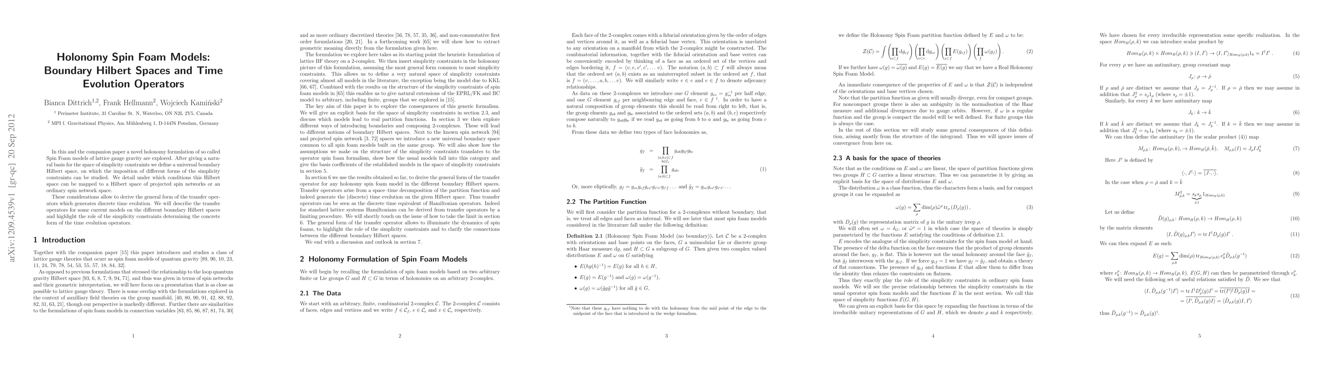 In this and the companion paper a novel holonomy formulation of so called Spin Foam models of lattice gauge gravity are explored. After giving a natural basis for the space of simplicity constraints we define a universal boundary Hilbert space, on which the imposition of different forms of the simplicity constraints can be studied. We detail under which conditions this Hilbert space can be mapped to a Hilbert space of projected spin networks or an ordinary spin network space. These considerations allow to derive the general form of the transfer operators which generates discrete time evolution. We will describe the transfer operators for some current models on the different boundary Hilbert spaces and highlight the role of the simplicity constraints determining the concrete form of the time evolution operators.