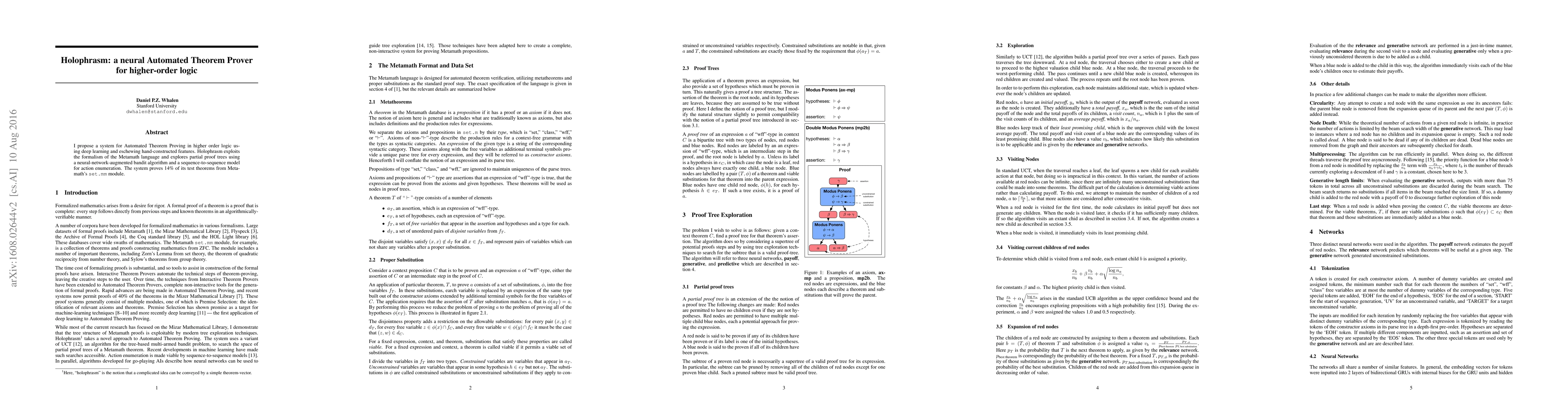 I propose a system for Automated Theorem Proving in higher order logic using deep learning and eschewing hand-constructed features. Holophrasm exploits the formalism of the Metamath language and explores partial proof trees using a neural-network-augmented bandit algorithm and a sequence-to-sequence model for action enumeration. The system proves 14% of its test theorems from Metamath's set.mm module.