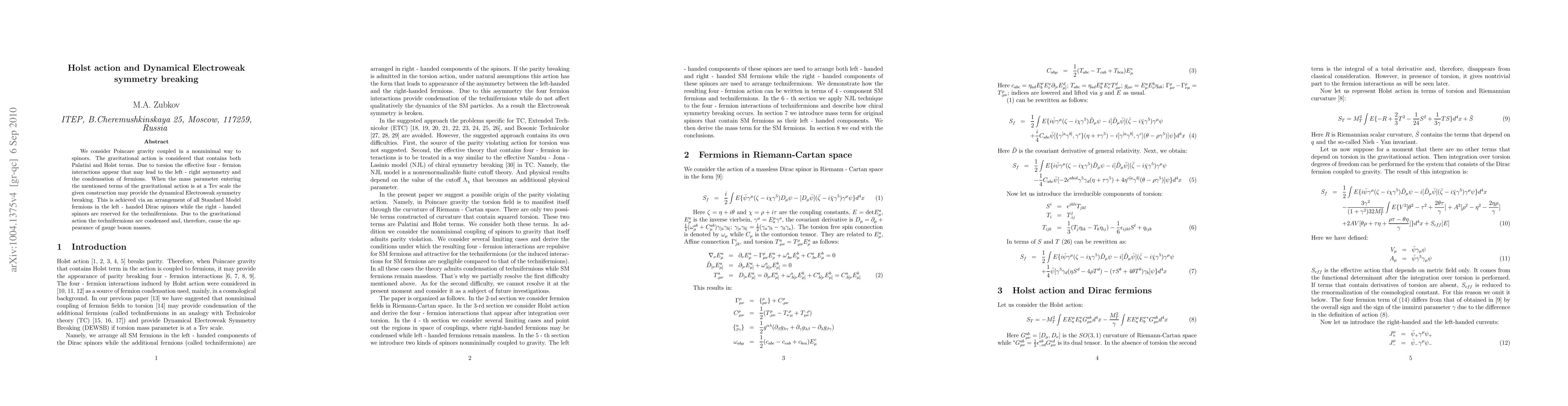 We consider Poincare gravity coupled in a nonminimal way to spinors. The gravitational action is considered that contains both Palatini and Holst terms. Due to torsion the effective four - fermion interactions appear that may lead to the left - right asymmetry and the condensation of fermions. When the mass parameter entering the mentioned terms of the gravitational action is at a Tev scale the given construction may provide the dynamical Electroweak symmetry breaking. This is achieved via an arrangement of all Standard Model fermions in the left - handed Dirac spinors while the right - handed spinors are reserved for the technifermions. Due to the gravitational action the technifermions are condensed and, therefore, cause the appearance of gauge boson masses.