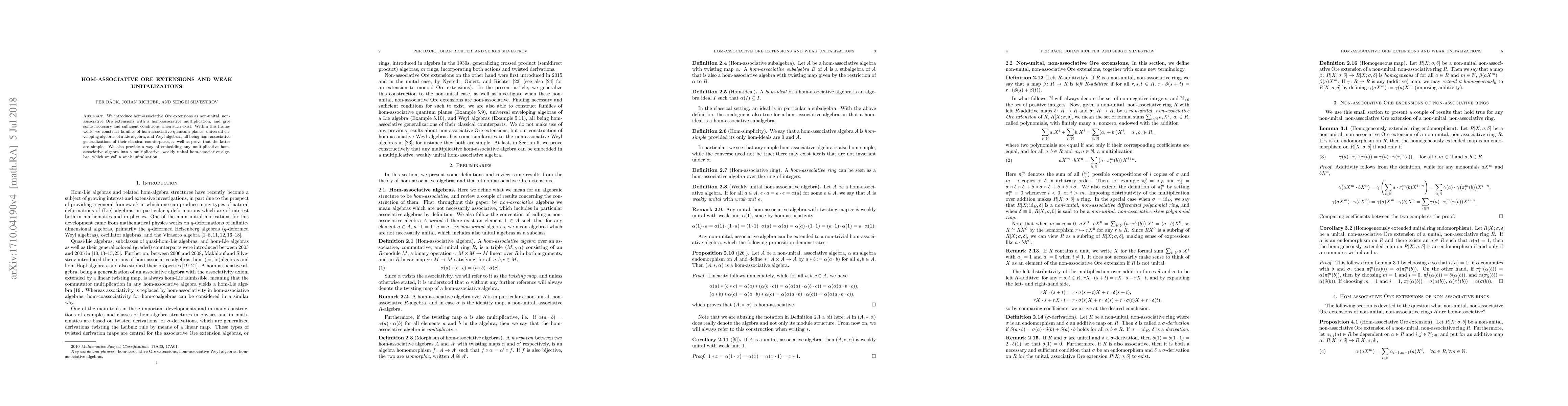 This paper introduces hom-associative Ore extensions, a non-unital, non-associative generalization with hom-associative multiplication, and identifies conditions for their existence. It constructs hom-associative versions of quantum planes, universal enveloping algebras, and Weyl algebras, proving the latter are simple, and presents a method for weak unitalization of any multiplicative hom-associative algebra.