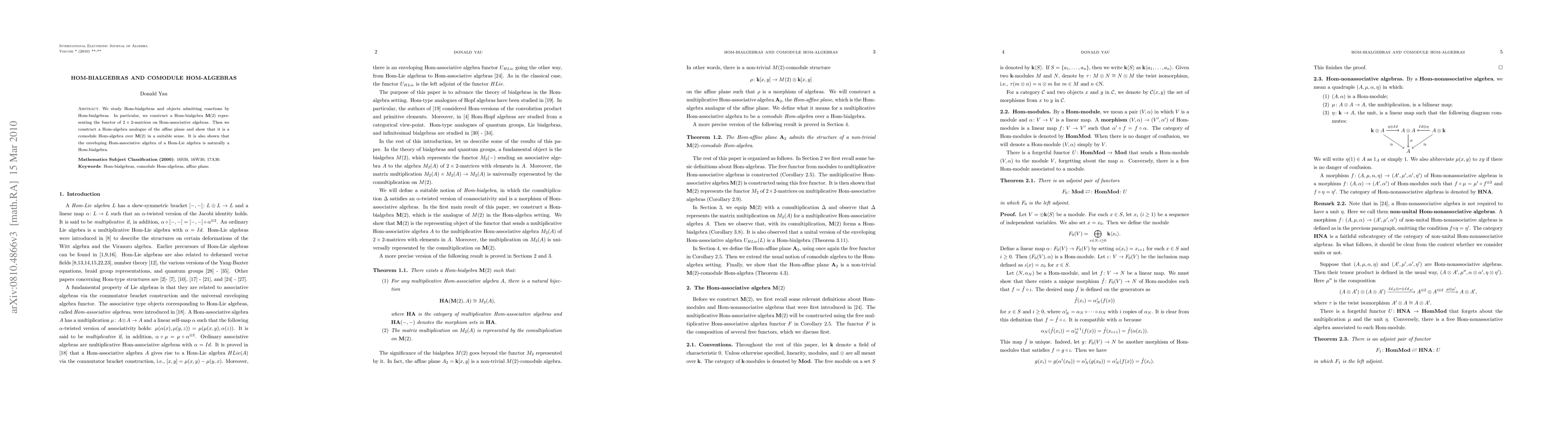 We study Hom-bialgebras and objects admitting coactions by Hom-bialgebras. In particular, we construct a Hom-bialgebra M representing the functor of 2x2-matrices on Hom-associative algebras. Then we construct a Hom-algebra analogue of the affine plane and show that it is a comodule Hom-algebra over M in a suitable sense. It is also shown that the enveloping Hom-associative algebra of a Hom-Lie algebra is naturally a Hom-bialgebra.