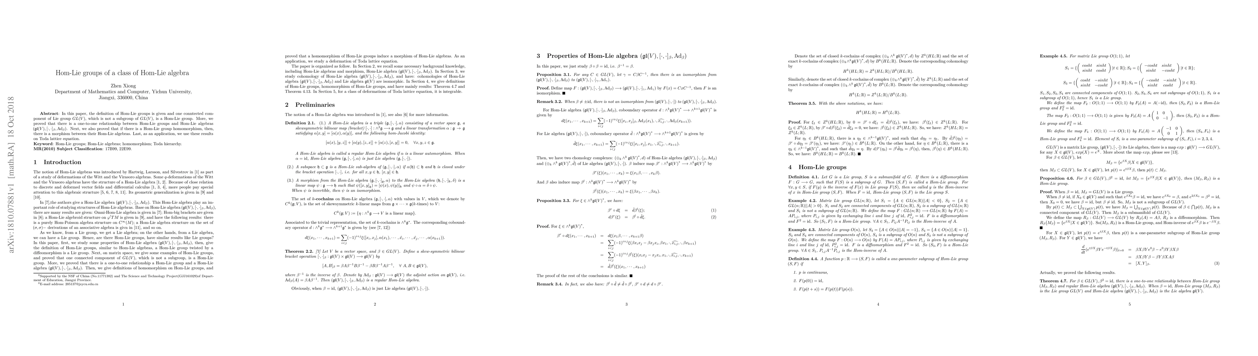 In this paper, the definition of Hom-Lie groups is given and one conntected component of Lie group $GL(V)$, which is not a subgroup of $GL(V)$, is a Hom-Lie group. More, we proved that there is a one-to-one relationship between Hom-Lie groups and Hom-Lie algebras $(\gl(V),[\cdot,\cdot]_\beta,\rm{Ad}_\beta)$. Next, we also proved that if there is a Hom-Lie group homomorphism, then, there is a morphism between their Hom-Lie algebras. Last, as an application, we use these results on Toda lattice equation.