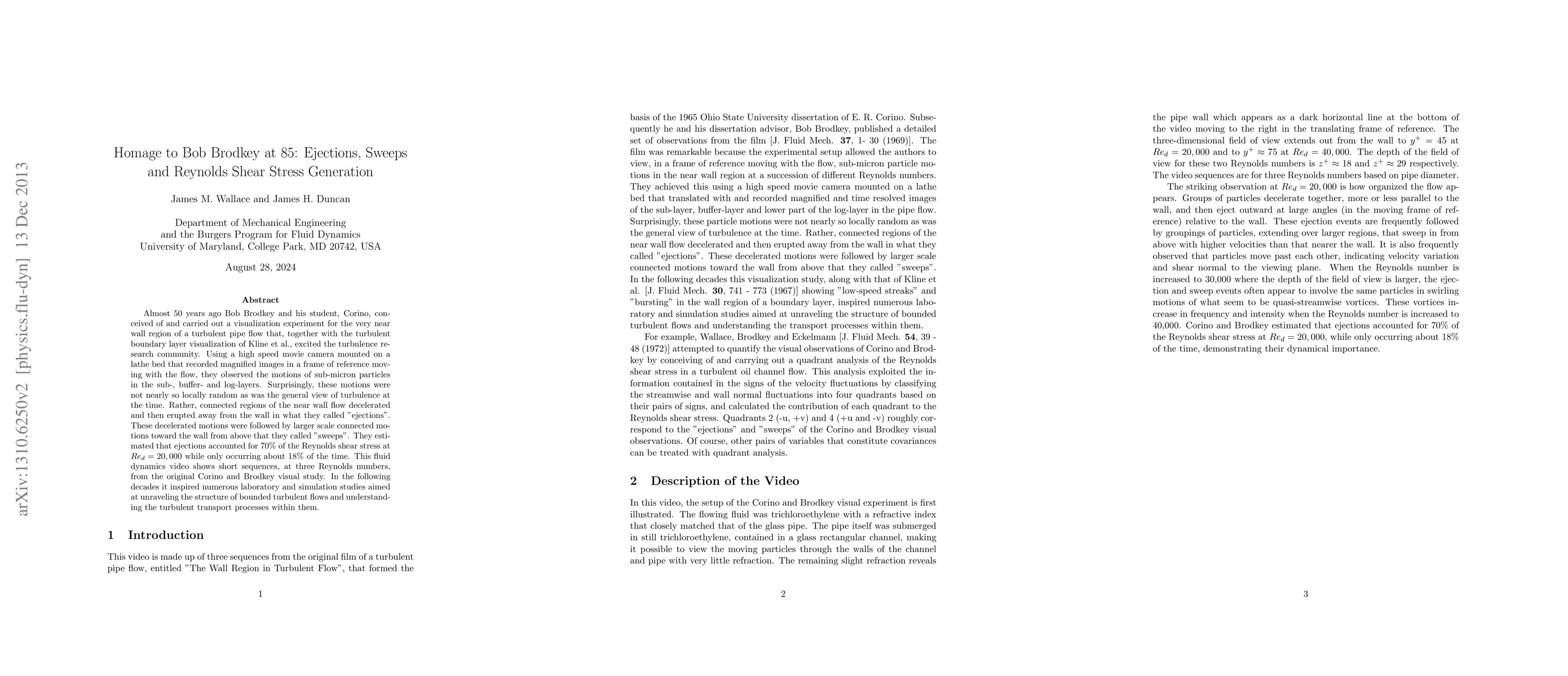 Almost 50 years ago Bob Brodkey and his student, Corino, conceived of and carried out a visualization experiment for the very near wall region of a turbulent pipe flow that, together with the turbulent boundary layer visualization of Kline et al., excited the turbulence research community. Using a high speed movie camera mounted on a lathe bed that recorded magnified images in a frame of reference moving with the flow, they observed the motions of sub-micron particles in the sub-, buffer- and log-layers. Surprisingly, these motions were not nearly so locally random as was the general view of turbulence at the time. Rather, connected regions of the near wall flow decelerated and then erupted away from the wall in what they called "ejections". These decelerated motions were followed by larger scale connected motions toward the wall from above that they called "sweeps". They estimated that ejections accounted for $70\%$ of the Reynolds shear stress at $Re_d = 20,000$ while only occurring about $18\%$ of the time. This fluid dynamics video shows short sequences, at three Reynolds numbers, from the original Corino and Brodkey visual study. In the following decades it inspired numerous laboratory and simulation studies aimed at unraveling the structure of bounded turbulent flows and understanding the turbulent transport processes within them.