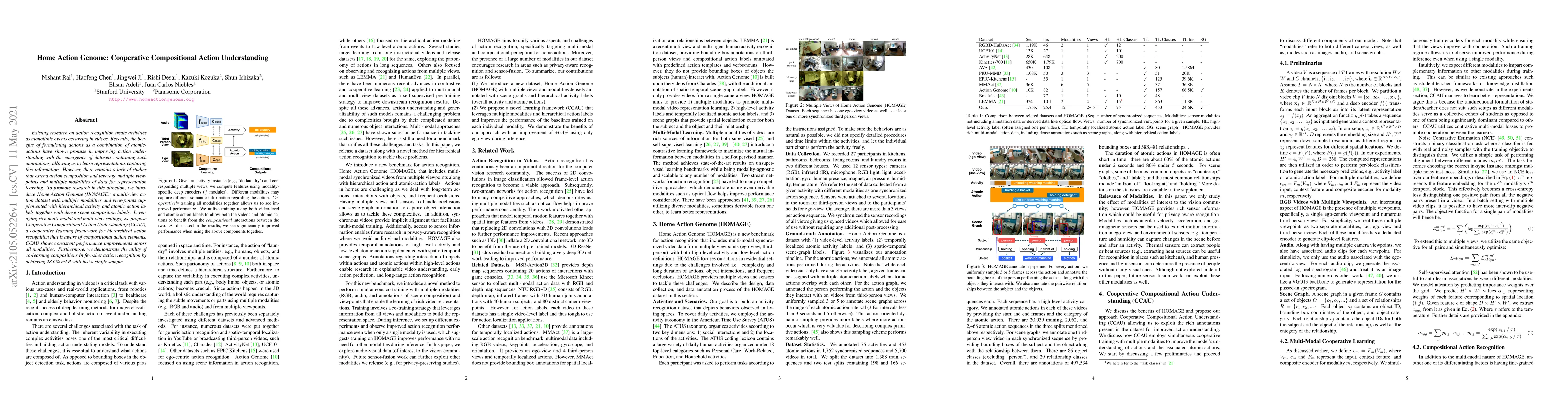 The paper introduces HOMAGE, a multi-view action dataset with rich multi-modal and compositional labels, and proposes CCAU, a cooperative learning framework for hierarchical action recognition that leverages these labels. CCAU demonstrates consistent performance improvements and achieves notable few-shot recognition results.