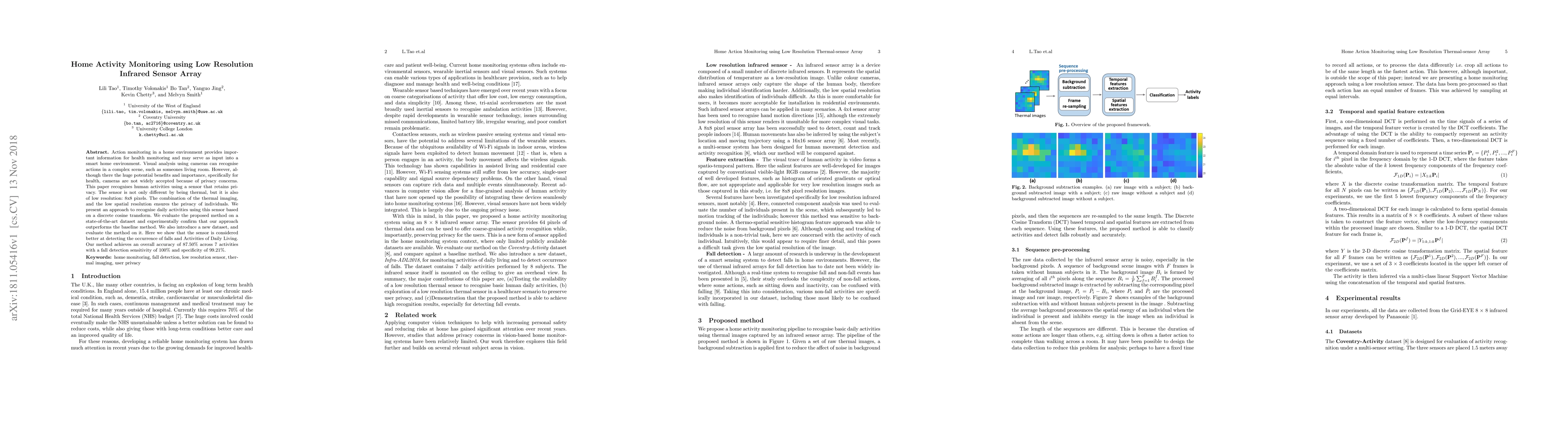 This paper proposes a method for recognizing human activities using a low-resolution infrared sensor to ensure privacy, achieving an accuracy of 87.50% for daily activities and 100% sensitivity for fall detection, outperforming baseline methods. The approach employs a discrete cosine transform and introduces a new dataset for evaluation.
