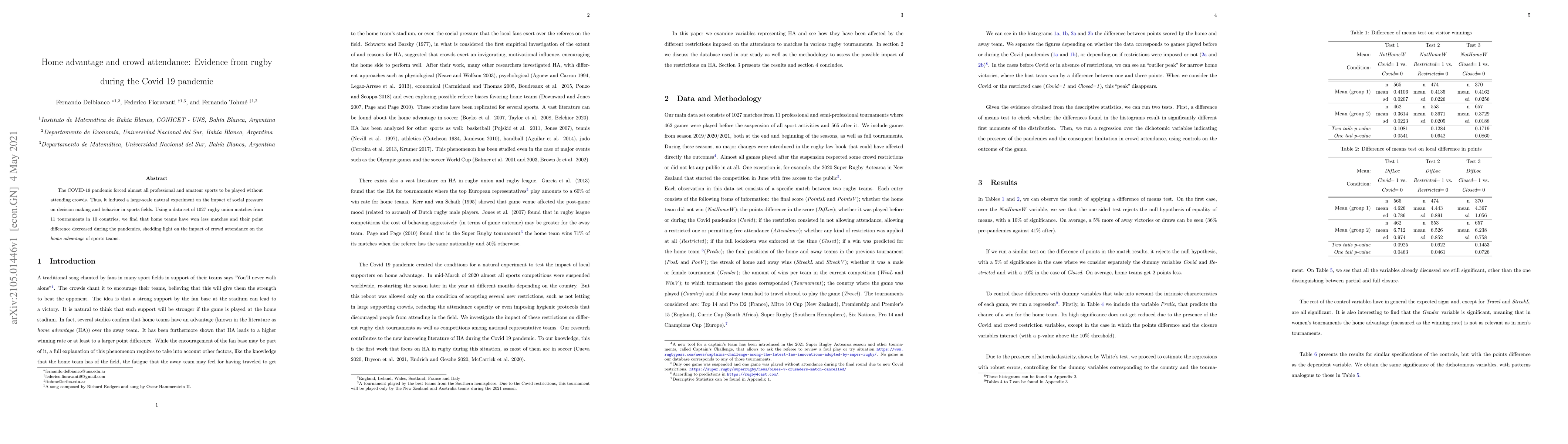 Summary: This study examines the effect of crowd attendance on home advantage in rugby during the COVID-19 pandemic, finding that home teams won fewer matches and had a reduced points advantage when played without spectators, highlighting the role of social pressure in sports performance.