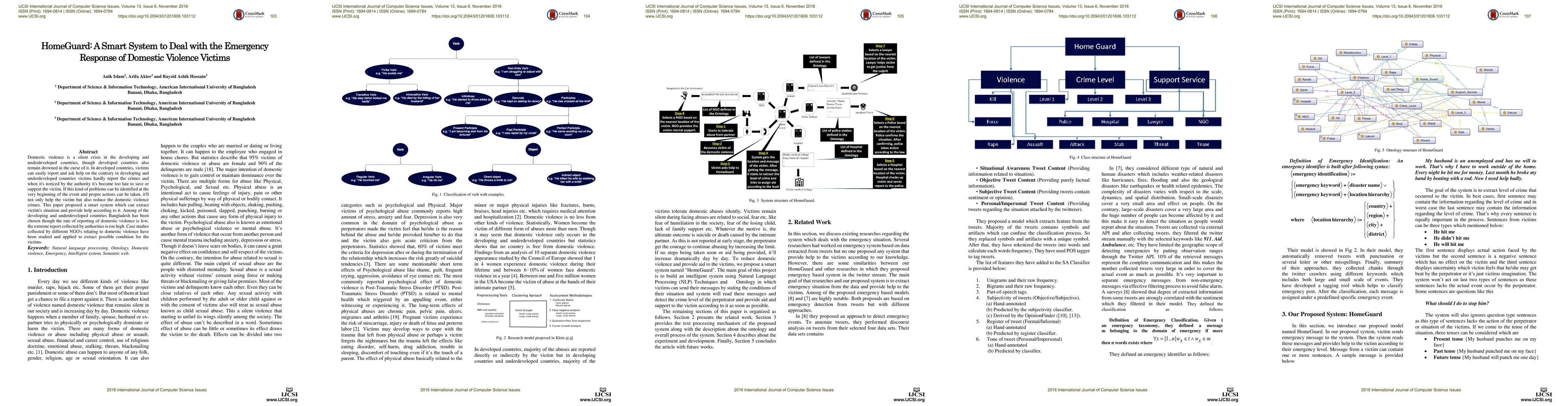 Title: HomeGuard: A Smart System to Deal with the Emergency Response of Domestic Violence Victims Summary: This paper proposes a smart system to identify and respond to domestic violence emergencies, particularly in developing countries like Bangladesh, where reporting is low but incidents are high. The system aims to provide timely assistance to victims, potentially reducing the overall incidence of domestic violence.