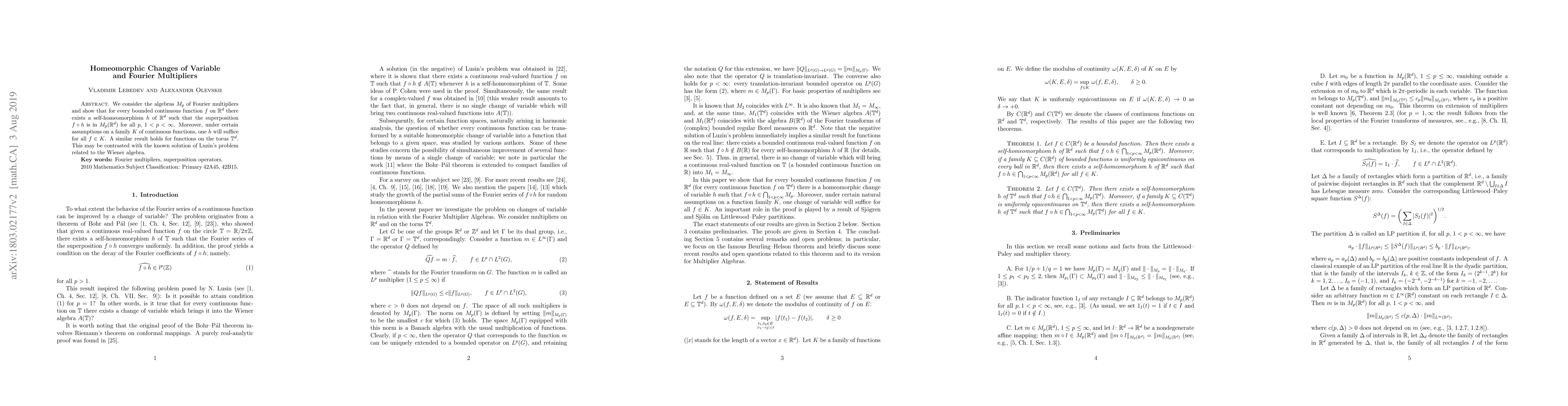 This paper demonstrates that any bounded continuous function on $\mathbb R^d$ can be transformed via a suitable homeomorphic change of variable into a function that is in the Fourier multiplier algebra $M_p$ for all $1<p<\infty$. Under specific conditions on a family of continuous functions, a single change of variable suffices for all functions in that family.