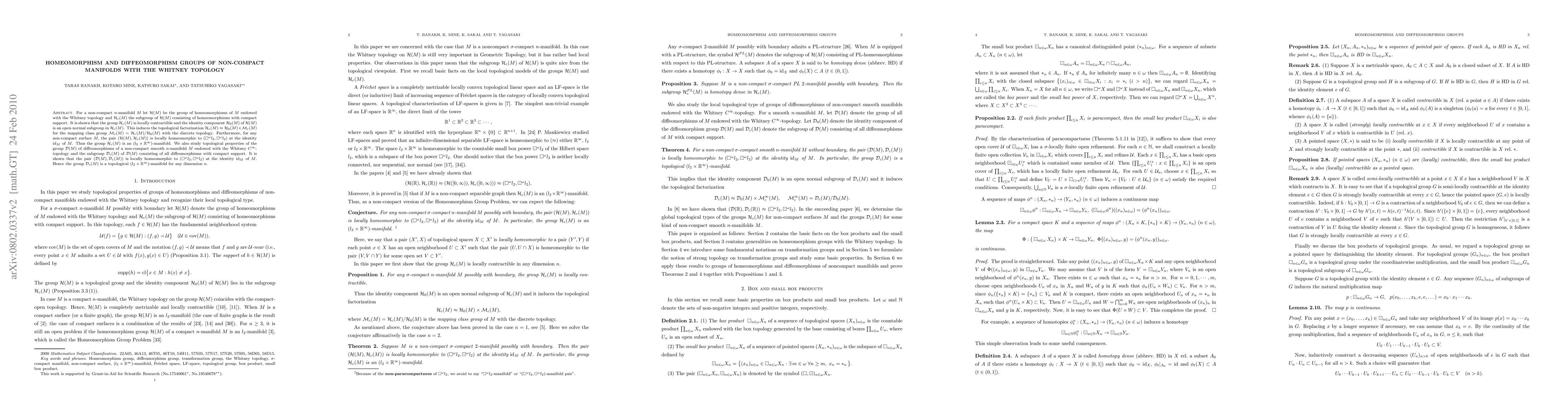 This paper investigates the topological properties of the groups of homeomorphisms and diffeomorphisms of non-compact manifolds with the Whitney topology, showing that the subgroup of homeomorphisms with compact support is locally contractible and that the identity component is an open normal subgroup. It also establishes that the group of diffeomorphisms with compact support is a topological (l_2 × R^\infty)-manifold.