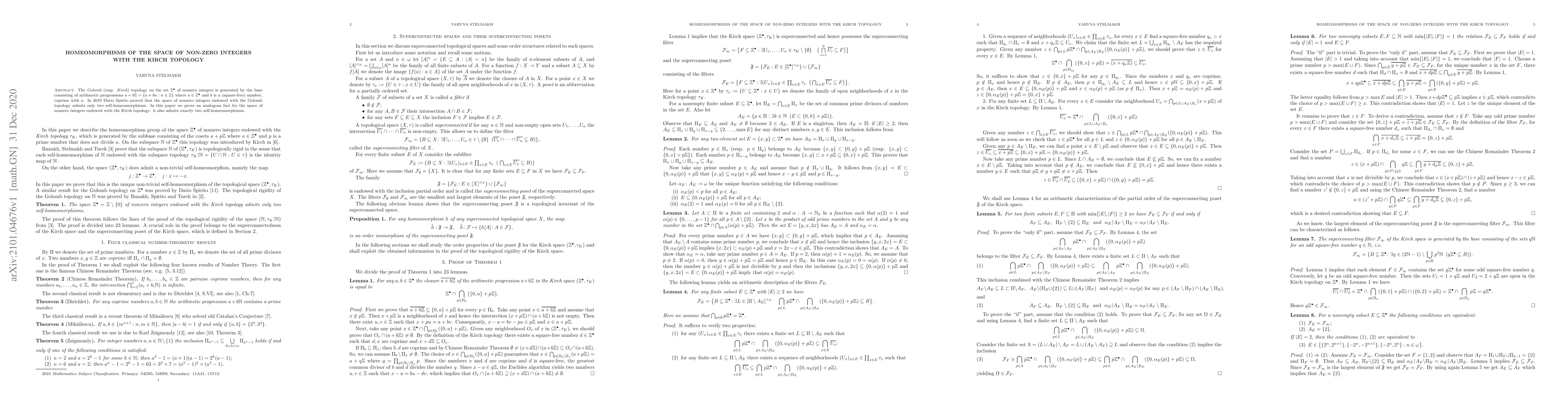 The $Golomb$ (resp. $Kirch$) topology on the set $\mathbb Z^\bullet$ of nonzero integers is generated by the base consisting of arithmetic progressions $a+b\mathbb Z=\{a+bn:n\in\mathbb Z\}$ where $a\in\mathbb Z^\bullet$ and $b$ is a (square-free) number, coprime with $a$. In 2019 Dario Spirito proved that the space of nonzero integers endowed with the Golomb topology admits only two self-homeomorphisms. In this paper we prove an analogous fact for the space of nonzero integers endowed with the Kirch topology: it also admits exactly two self-homeomorphisms.