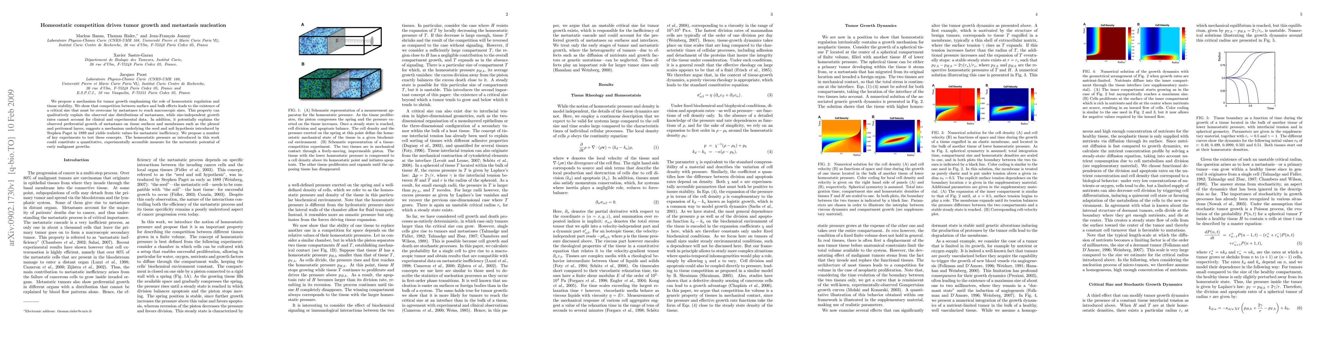 This paper proposes a homeostatic competition mechanism explaining tumor growth and metastasis nucleation, suggesting that a critical size must be surpassed for metastases to grow macroscopically. It also offers insights into the preferential growth of metastases on tissue surfaces, supporting the seed and soil hypothesis.