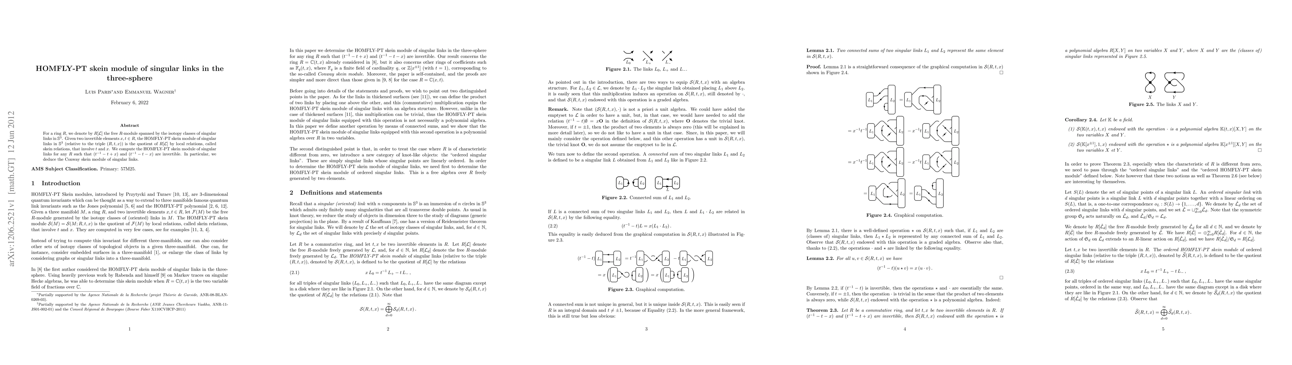 This paper computes the HOMFLY-PT skein module for singular links in the three-sphere, establishing it as a quotient of a free module over a ring $R$ by skein relations involving elements $t$ and $x$. The study also deduces the Conway skein module for specific conditions on $t$ and $x$.