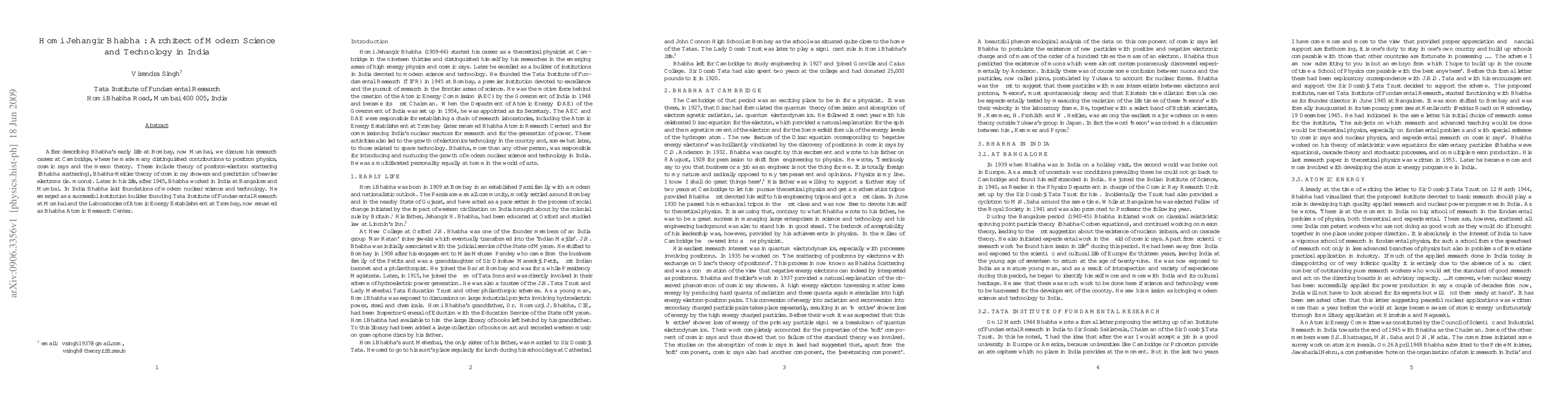 After describing Bhabha's early life at Bombay, now Mumbai, we discuss his research career at Cambridge, where he made many distinguished contributions to positron physics, cosmic rays and the meson theory. These include theory of positron-electron scattering (Bhabha scattering), Bhabha-Heitler theory of cosmic ray showers and prediction of heavier electrons (ie. muons). Later in his life, after 1945, Bhabha worked in India at Bangalore and Mumbai. In India Bhabha laid foundations of modern nuclear science and technology. He emerged as a successful institution builder founding Tata Institute of Fundamental Research at Mumbai and the Laboratories of Atomic Energy Establishment at Trombay, now renamed as Bhabha Atomic Research Center.