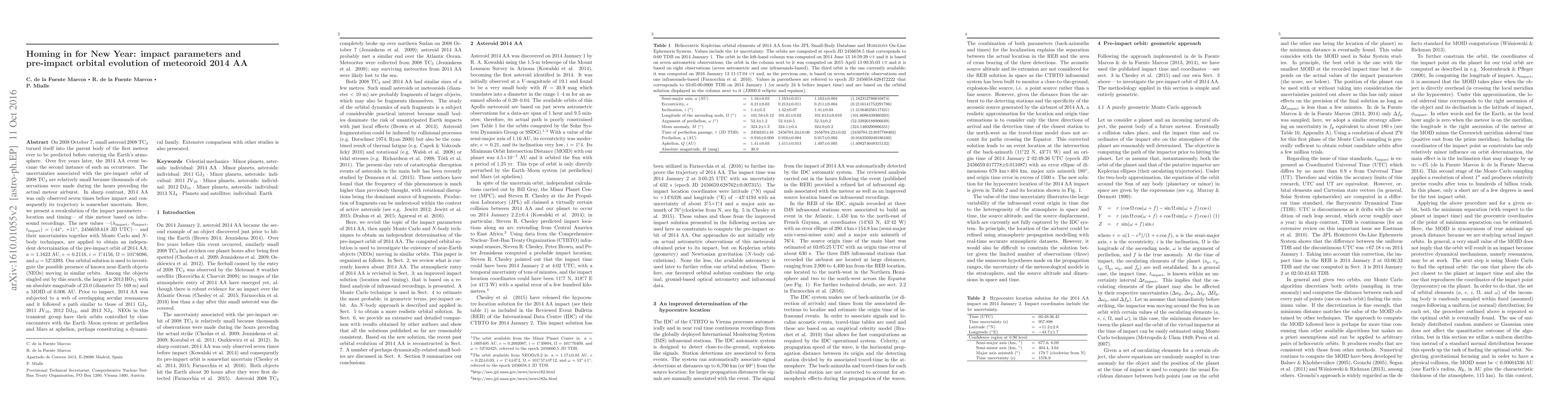 On 2008 October 7, small asteroid 2008 TC3 turned itself into the parent body of the first meteor ever to be predicted before entering the Earth's atmosphere. Over five years later, the 2014 AA event became the second instance of such an occurrence. The uncertainties associated with the pre-impact orbit of 2008 TC3 are relatively small because thousands of observations were made during the hours preceding the actual meteor airburst. In sharp contrast, 2014 AA was only observed seven times before impact and consequently its trajectory is somewhat uncertain. Here, we present a recalculation of the impact parameters -location and timing- of this meteor based on infrasound recordings. The new values and their uncertainties together with Monte Carlo and N-body techniques, are applied to obtain an independent determination of the pre-impact orbit of 2014 AA. Our orbital solution is used to investigate the possible presence of known near-Earth objects (NEOs) moving in similar orbits. Prior to impact, 2014 AA was subjected to a web of overlapping secular resonances and it followed a path similar to those of 2011 GJ3, 2011 JV10, 2012 DJ54, and 2013 NJ4. NEOs in this transient group have their orbits controlled by close encounters with the Earth-Moon system at perihelion and Mars at aphelion, perhaps constituting a dynamical family. Extensive comparison with other studies is also presented.