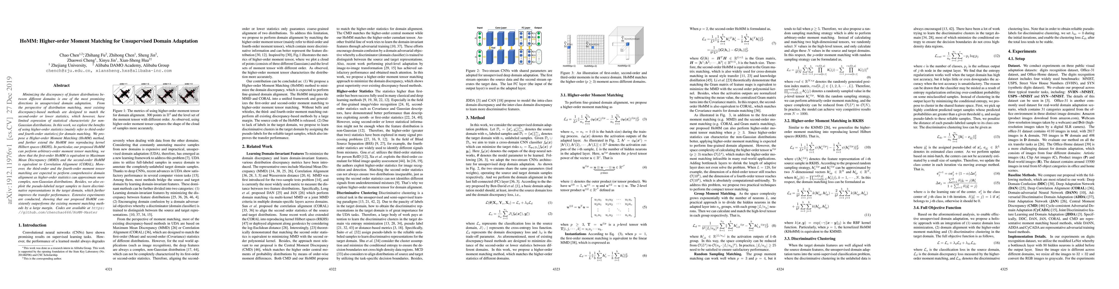 The paper proposes a Higher-order Moment Matching (HoMM) method for unsupervised domain adaptation, leveraging third- and fourth-order statistics to better match non-Gaussian distributions. The method extends to reproducing kernel Hilbert spaces and outperforms existing methods in extensive experiments.