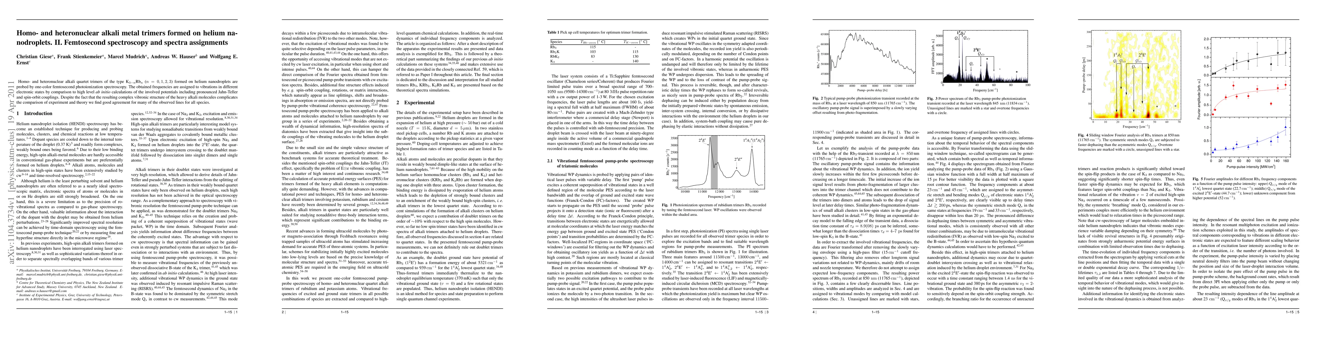 This paper investigates homo- and heteronuclear alkali metal trimers (K_{3-n}Rb_{n}) on helium nanodroplets using femtosecond spectroscopy. The study assigns observed frequencies to vibrations in various electronic states, achieving good agreement between experimental results and high-level ab initio calculations, despite complex vibronic structures.