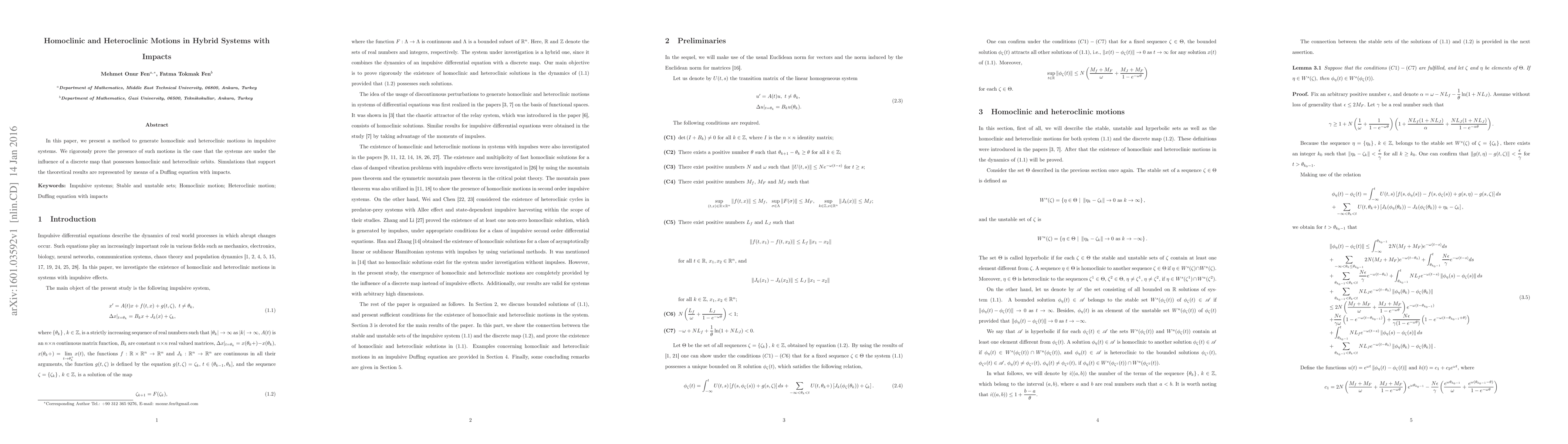 This paper develops a method to generate homoclinic and heteroclinic motions in impulsive hybrid systems, proving their existence under a discrete map with corresponding orbits. Simulations using a Duffing equation with impacts validate the theoretical findings.
