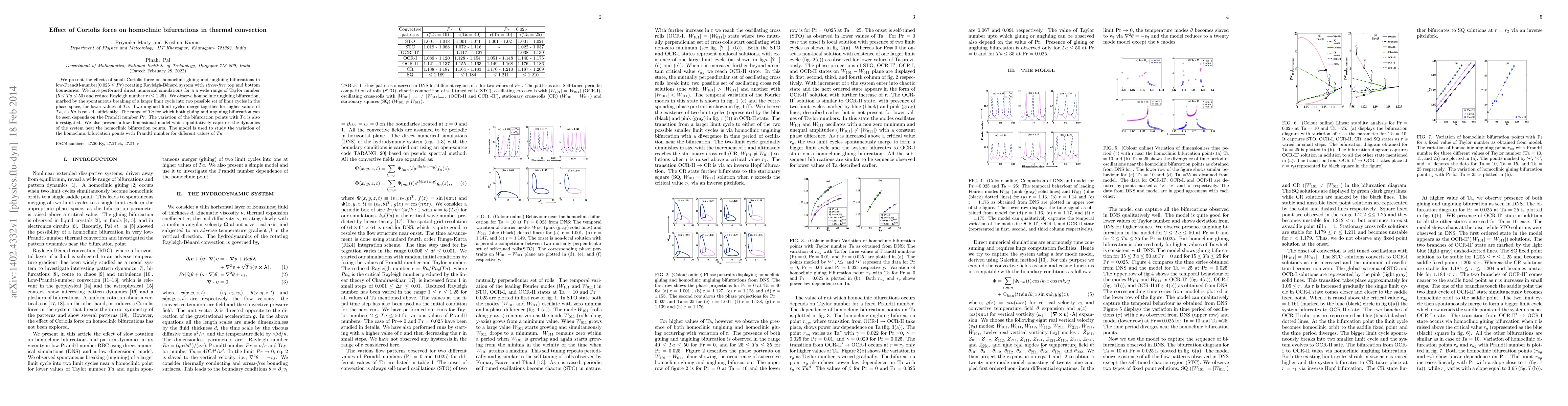 We present results of direct numerical simulations on homoclinic gluing and ungluing bifurcations in low-Prandtl-number ($ 0 \leq Pr \leq 0.025 $) Rayleigh-B\'{e}nard system rotating slowly and uniformly about a vertical axis. We have performed simulations with \textit{stress-free} top and bottom boundaries for several values of Taylor number ($5 \leq Ta \leq 50$) near the instability onset. We observe a single homoclinic ungluing bifurcation, marked by the spontaneous breaking of a larger limit cycle into two limit cycles with the variation of the reduced Rayleigh number $r$ for smaller values of $Ta (< 25)$. A pair of homoclinic bifurcations, instead of one bifurcation, is observed with variation of $r$ for slightly higher values of $Ta$ ($25 \leq Ta \leq 50$) in the same fluid dynamical system. The variation of the bifurcation threshold with $Ta$ is also investigated. We have also constructed a low-dimensional model which qualitatively captures the dynamics of the system near the homoclinic bifurcations for low rotation rates. The model is used to study the unfolding of bifurcations and the variation of the homoclinic bifurcation threshold with $Pr$.