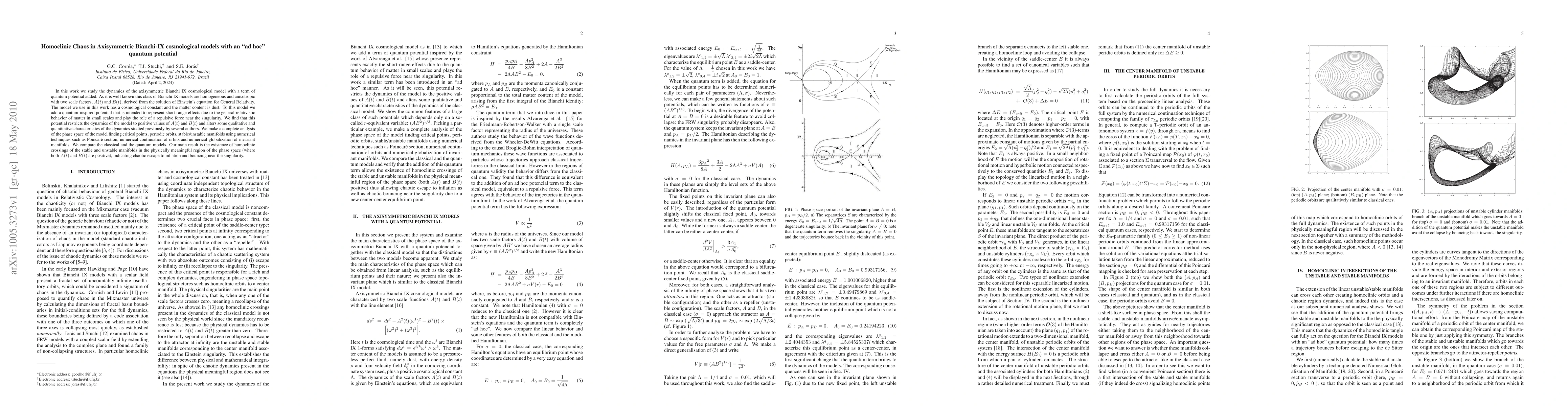 In this work we study the dynamics of the axisymmetric Bianchi IX cosmological model with a term of quantum potential added. As it is well known this class of Bianchi IX models are homogeneous and anisotropic with two scale factors, $A(t)$ and $B(t)$, derived from the solution of Einstein's equation for General Relativity. The model we use in this work has a cosmological constant and the matter content is dust. To this model we add a quantum-inspired potential that is intended to represent short-range effects due to the general relativistic behavior of matter in small scales and play the role of a repulsive force near the singularity. We find that this potential restricts the dynamics of the model to positive values of $A(t)$ and $B(t)$ and alters some qualitative and quantitative characteristics of the dynamics studied previously by several authors. We make a complete analysis of the phase space of the model finding critical points, periodic orbits, stable/unstable manifolds using numerical techniques such as Poincar\'e section, numerical continuation of orbits and numerical globalization of invariant manifolds. We compare the classical and the quantum models. Our main result is the existence of homoclinic crossings of the stable and unstable manifolds in the physically meaningful region of the phase space (where both $A(t)$ and $B(t)$ are positive), indicating chaotic escape to inflation and bouncing near the singularity.