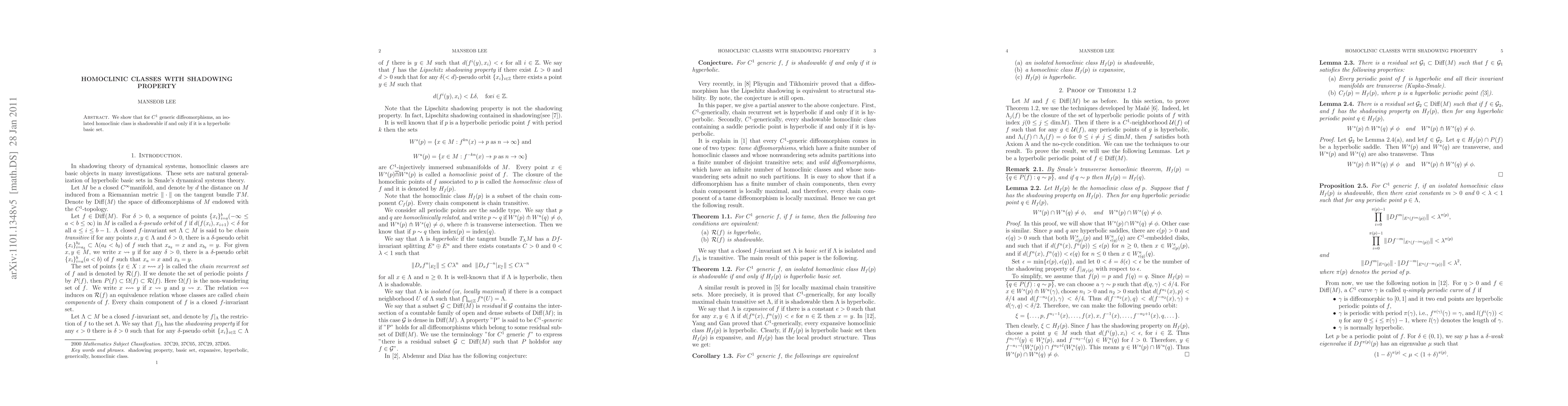 We show that for $C^1$ generic diffeomorphisms, an isolated homoclinic class is shadowable if and only if homoclinic class is hyperbolic basic set.