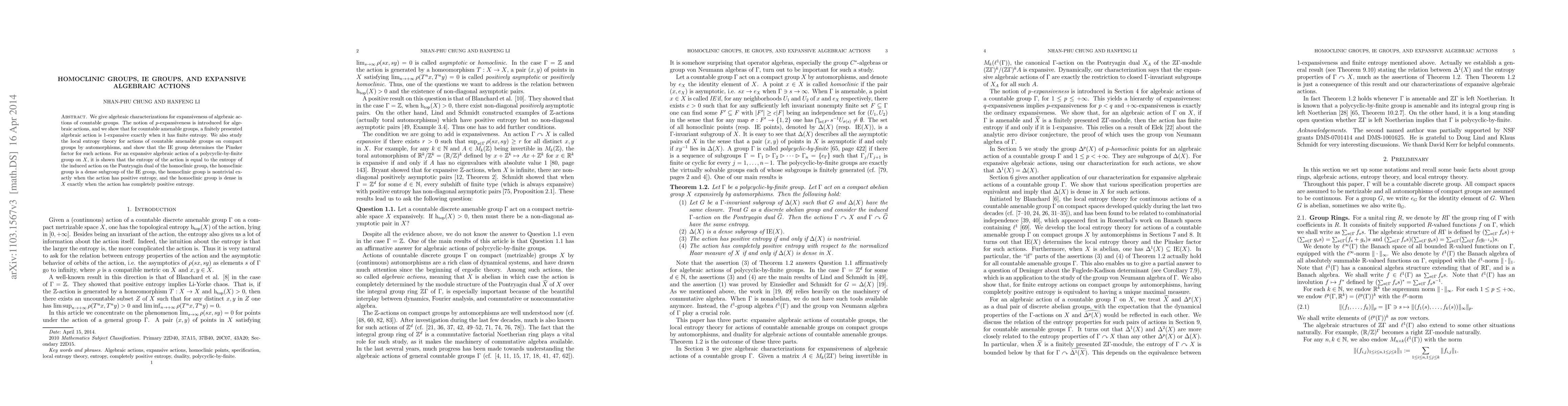 We give algebraic characterizations for expansiveness of algebraic actions of countable groups. The notion of p-expansiveness is introduced for algebraic actions, and we show that for countable amenable groups, a finitely presented algebraic action is 1-expansive exactly when it has finite entropy. We also study the local entropy theory for actions of countable amenable groups on compact groups by automorphisms, and show that the IE group determines the Pinsker factor for such actions. For an expansive algebraic action of a polycyclic-by-finite group on X, it is shown that the entropy of the action is equal to the entropy of the induced action on the Pontryagin dual of the homoclinic group, the homoclinic group is a dense subgroup of the IE group, the homoclinic group is nontrivial exactly when the action has positive entropy, and the homoclinic group is dense in X exactly when the action has completely positive entropy.