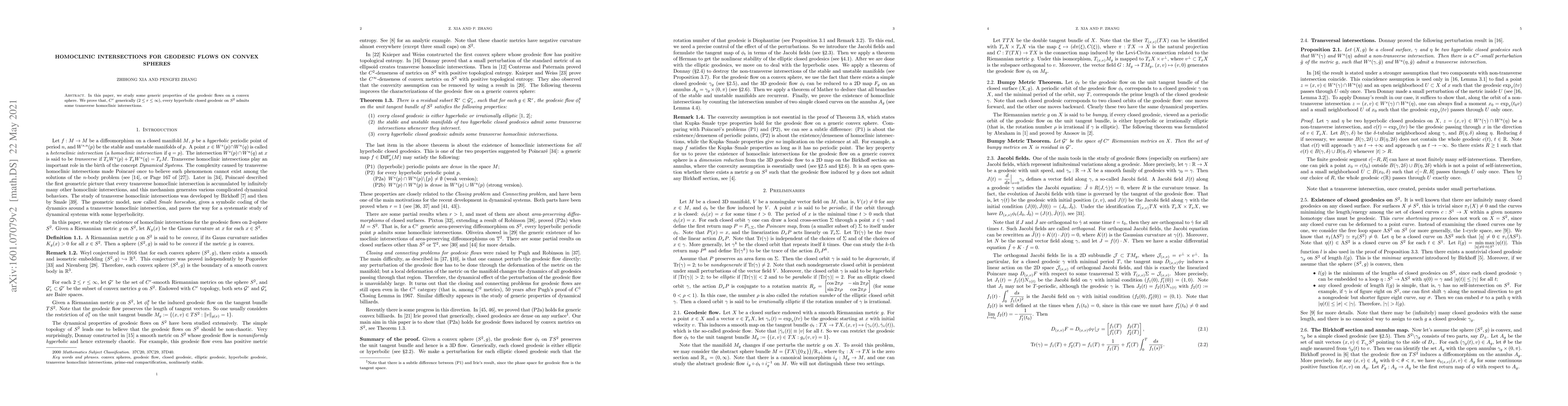 Summary: This paper investigates the generic properties of geodesic flows on convex spheres, proving that, for most cases, hyperbolic closed geodesics exhibit transversal homoclinic intersections. These intersections are significant for understanding the dynamical behavior of the geodesic flows.