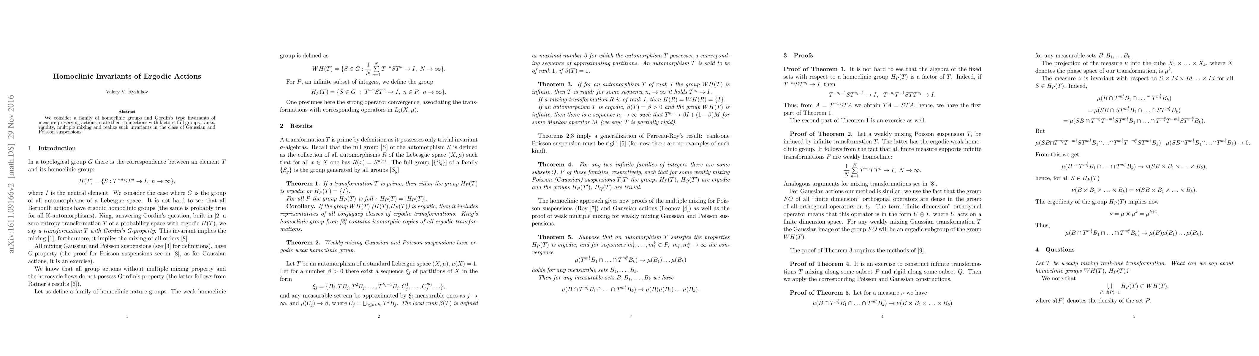 This paper explores homoclinic groups and Gordin's invariants in ergodic theory, connecting them to factors, full groups, and mixing properties, and demonstrates their application in Gaussian and Poisson suspensions. It investigates the rigidity and multiple mixing characteristics through these invariants.