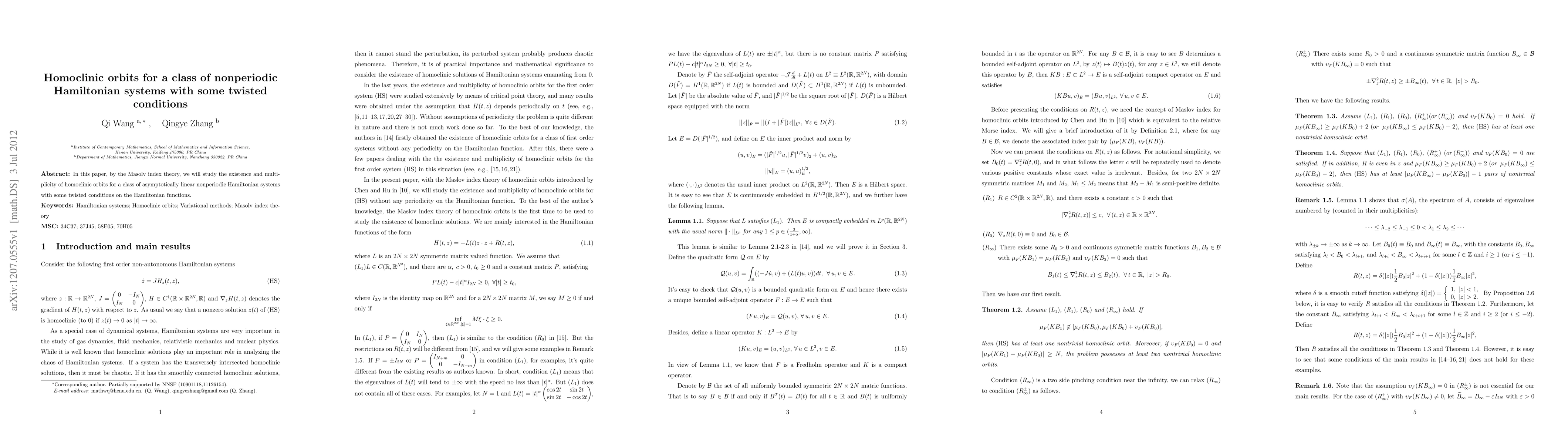 Summary: This paper employs Masolv index theory to investigate the existence and multiplicity of homoclinic orbits in nonperiodic Hamiltonian systems characterized by asymptotic linearity and specific twisted conditions on the Hamiltonian functions.