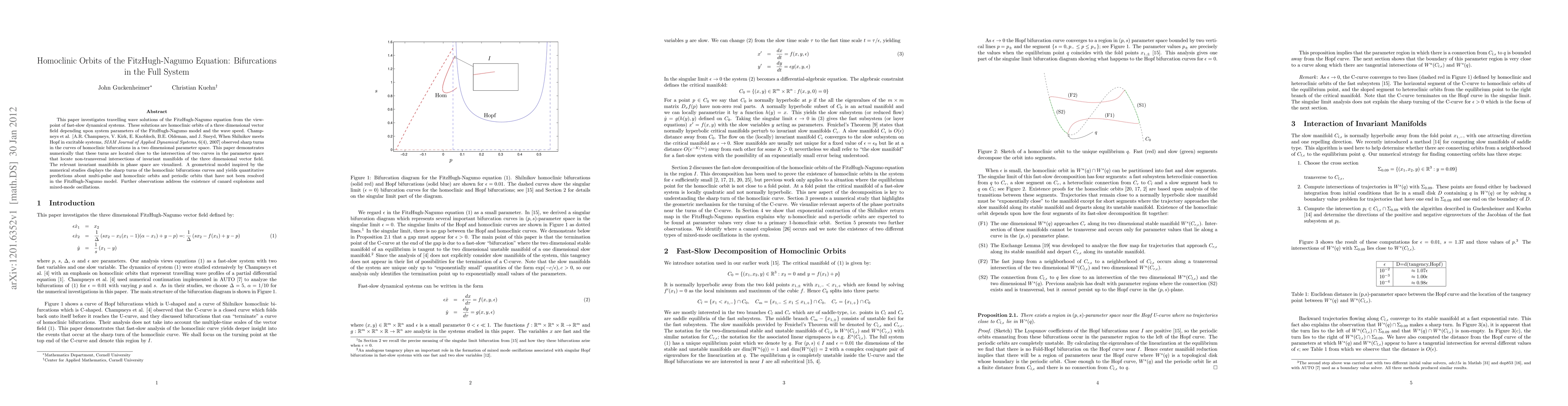 The paper presents a numerical study of homoclinic orbits in the FitzHugh-Nagumo equation, providing visualizations of invariant manifolds and a geometrical model to predict complex dynamics.