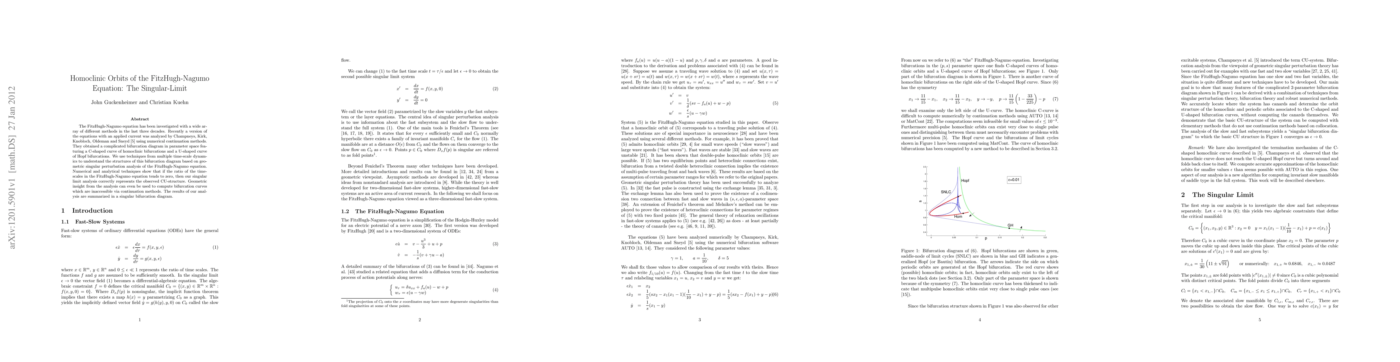 The FitzHugh-Nagumo equation has been investigated with a wide array of different methods in the last three decades. Recently a version of the equations with an applied current was analyzed by Champneys, Kirk, Knobloch, Oldeman and Sneyd using numerical continuation methods. They obtained a complicated bifurcation diagram in parameter space featuring a C-shaped curve of homoclinic bifurcations and a U-shaped curve of Hopf bifurcations. We use techniques from multiple time-scale dynamics to understand the structures of this bifurcation diagram based on geometric singular perturbation analysis of the FitzHugh-Nagumo equation. Numerical and analytical techniques show that if the ratio of the time-scales in the FitzHugh-Nagumo equation tends to zero, then our singular limit analysis correctly represents the observed CU-structure. Geometric insight from the analysis can even be used to compute bifurcation curves which are inaccessible via continuation methods. The results of our analysis are summarized in a singular bifurcation diagram.