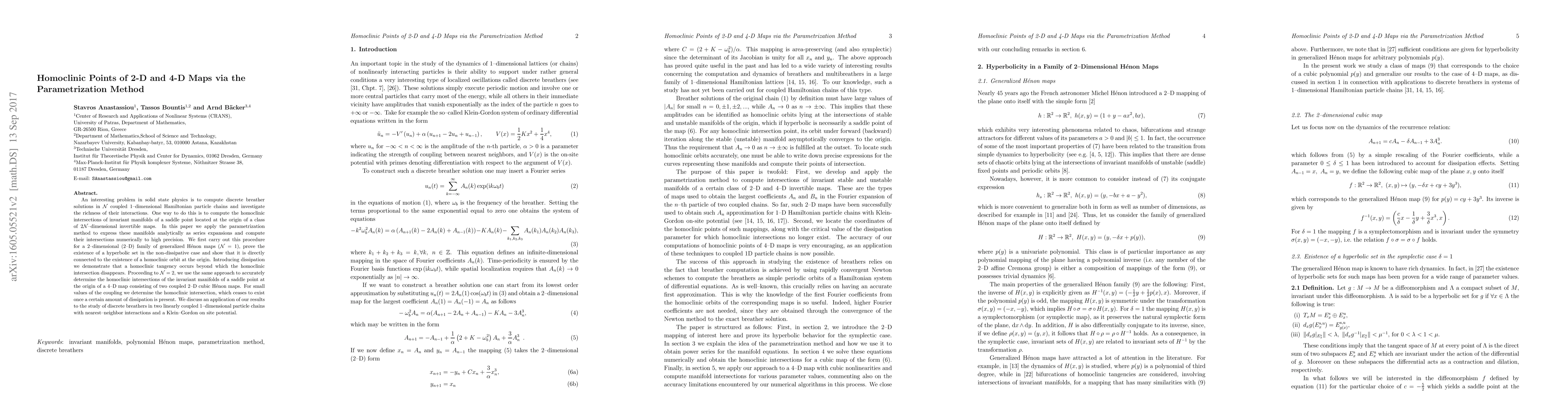 An interesting problem in solid state physics is to compute discrete breather solutions in $\mathcal{N}$ coupled 1--dimensional Hamiltonian particle chains and investigate the richness of their interactions. One way to do this is to compute the homoclinic intersections of invariant manifolds of a saddle point located at the origin of a class of $2\mathcal{N}$--dimensional invertible maps. In this paper we apply the parametrization method to express these manifolds analytically as series expansions and compute their intersections numerically to high precision. We first carry out this procedure for a 2--dimensional (2--D) family of generalized Henon maps ($\mathcal{N}$=1), prove the existence of a hyperbolic set in the non-dissipative case and show that it is directly connected to the existence of a homoclinic orbit at the origin. Introducing dissipation we demonstrate that a homoclinic tangency occurs beyond which the homoclinic intersection disappears. Proceeding to $\mathcal{N}=2$, we use the same approach to determine the homoclinic intersections of the invariant manifolds of a saddle point at the origin of a 4--D map consisting of two coupled 2--D cubic H\'enon maps. In dependence of the coupling the homoclinic intersection is determined, which ceases to exist once a certain amount of dissipation is present. We discuss an application of our results to the study of discrete breathers in two linearly coupled 1--dimensional particle chains with nearest--neighbor interactions and a Klein--Gordon on site potential.