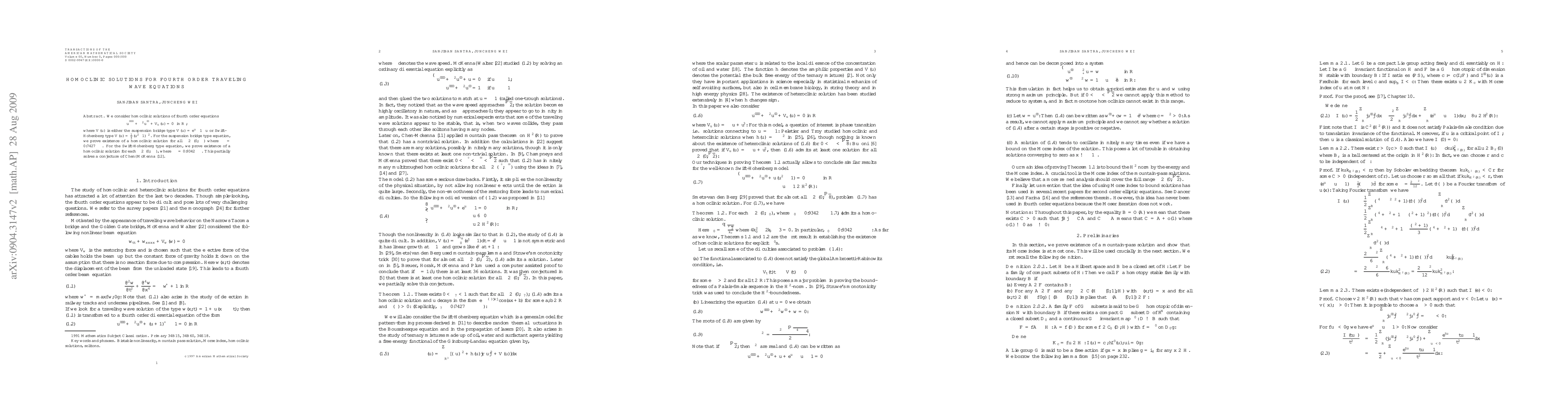 We consider homoclinic solutions of fourth order equations $$ u^{""} + \beta^2 u^{"} + V_u (u)=0 {in} \R ,$$ where $V(u)$ is either the suspension bridge type $V(u)=e^u-1-u$ or Swift-Hohenberg type $ V(u)= {1/4}(u^2-1)^2$. For the suspension bridge type equation, we prove existence of a homoclinic solution for {\em all} $ \beta \in (0, \beta_*)$ where $ \beta_{*}= 0.7427...$. For the Swift-Hohenberg type equation, we prove existence of a homoclinic solution for each $\beta \in (0, \beta_{*})$, where $\beta_{*}=0.9342...$. This partially solves a conjecture of Chen--McKenna \cite{YCM1}.