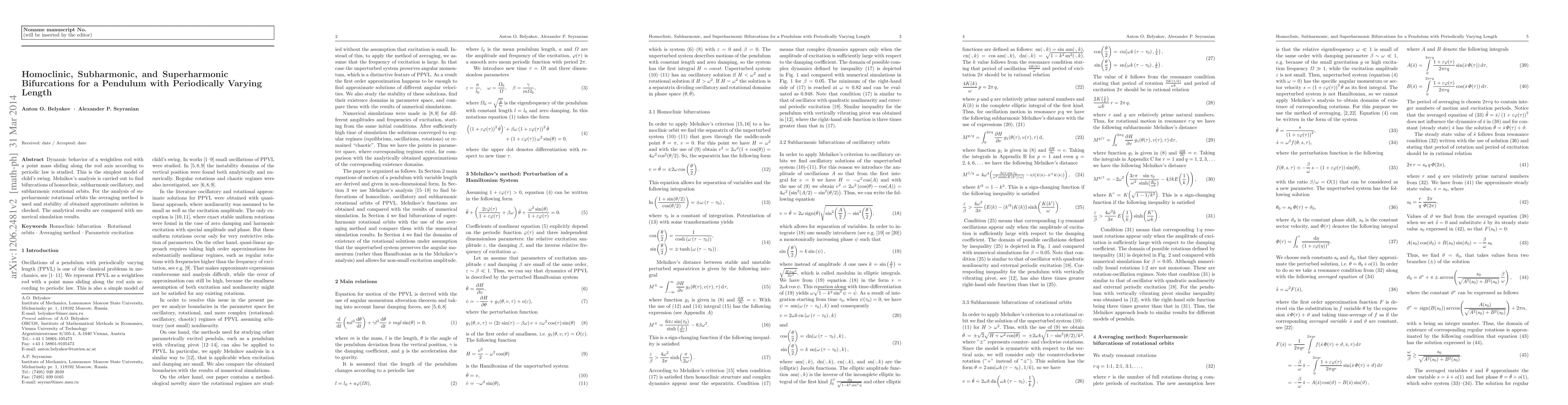 Dynamic behavior of a weightless rod with a point mass sliding along the rod axis according to periodic law is studied. This is the simplest model of child's swing. Melnikov's analysis is carried out to find bifurcations of homoclinic, subharmonic oscillatory, and subharmonic rotational orbits. For the analysis of superharmonic rotational orbits the averaging method is used and stability of obtained approximate solution is checked. The analytical results are compared with numerical simulation results.