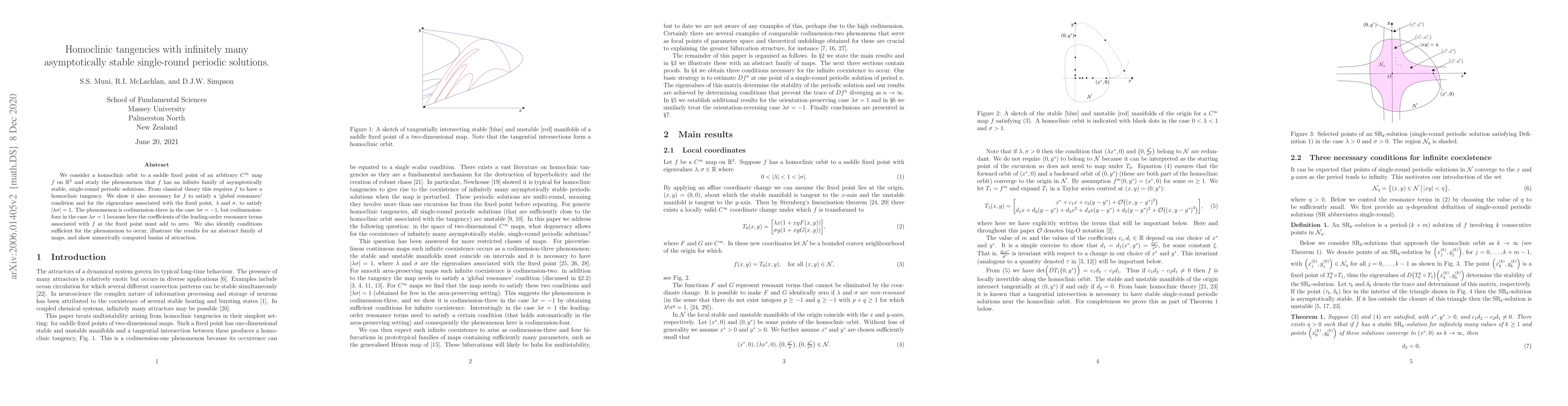 This paper investigates homoclinic tangencies in $C^\infty$ maps on $\mathbb{R}^2$ that lead to infinitely many asymptotically stable, single-round periodic solutions, requiring a global resonance condition and specific eigenvalue relationships. The phenomenon is codimension-three when $\lambda \sigma = -1$ and codimension-four when $\lambda \sigma = 1$.