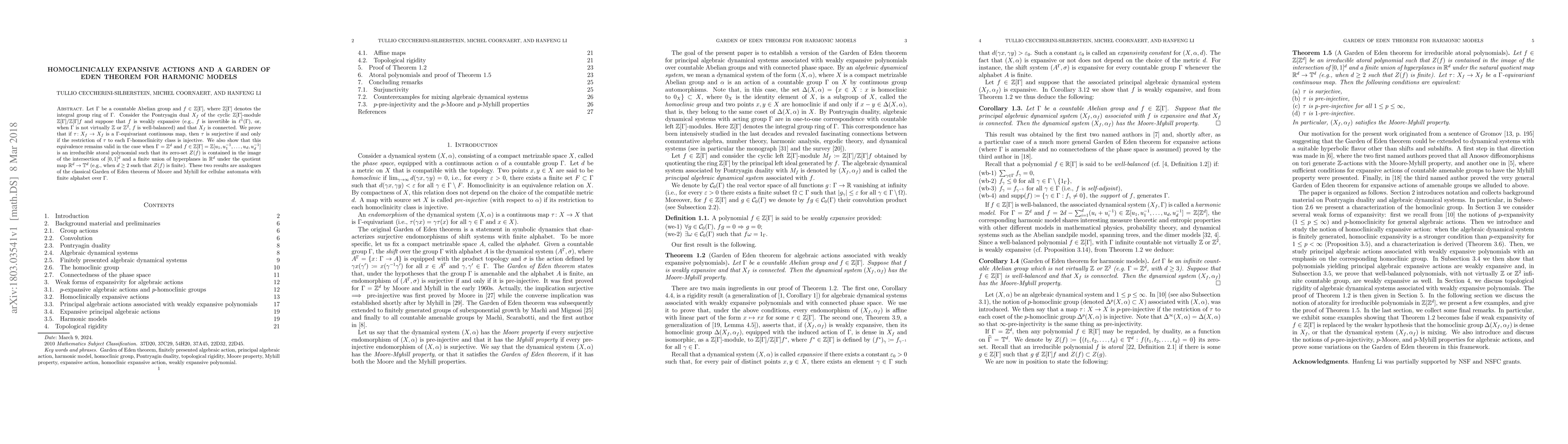 This paper proves a Garden of Eden theorem for harmonic models defined by weakly expansive elements in the integral group ring of a countable Abelian group $\Gamma$. It establishes that a $\Gamma$-equivariant map on the dual space is surjective if and only if it is injective on each homoclinicity class, extending classical results to more general algebraic structures.
