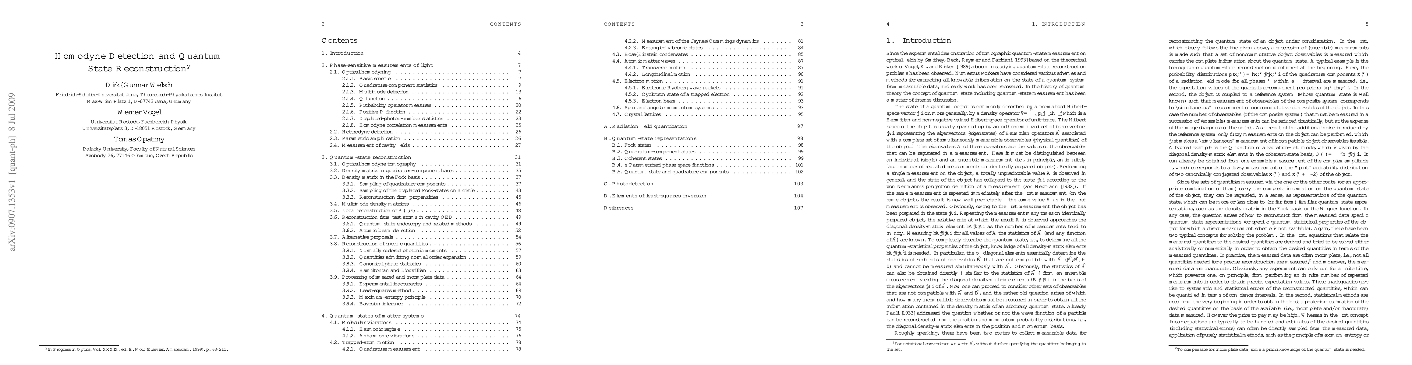 This paper reviews phase-sensitive measurement techniques like homodyne detection for both radiation fields and material systems, and discusses methods for reconstructing quantum states in various contexts including multimode radiation, molecular vibrations, and Bose-Einstein condensates.