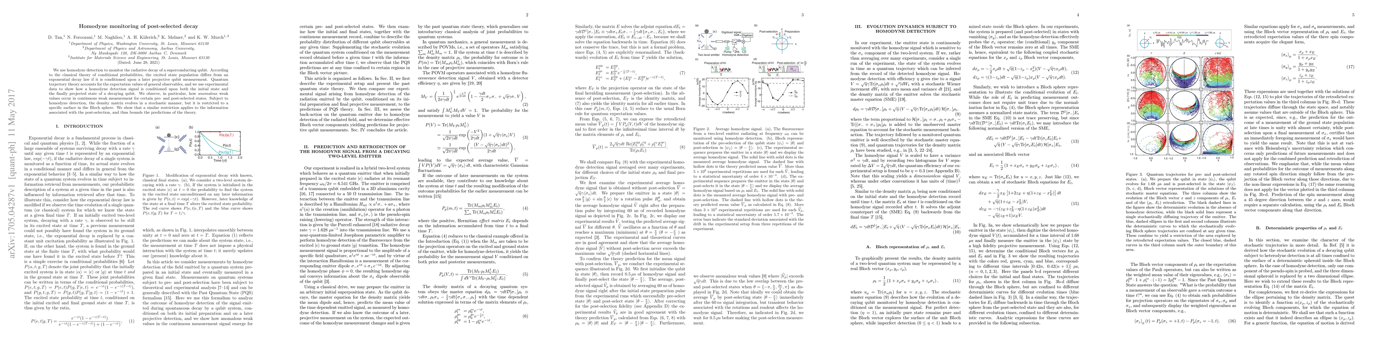 This paper investigates the radiative decay of a superconducting qubit using homodyne detection, demonstrating how the decay process deviates from classical exponential decay under post-selection conditions. The study reveals anomalous weak values and stochastic evolution of the density matrix, constrained to a specific Bloch sphere surface, highlighting the impact of initial and final states on the decay dynamics.