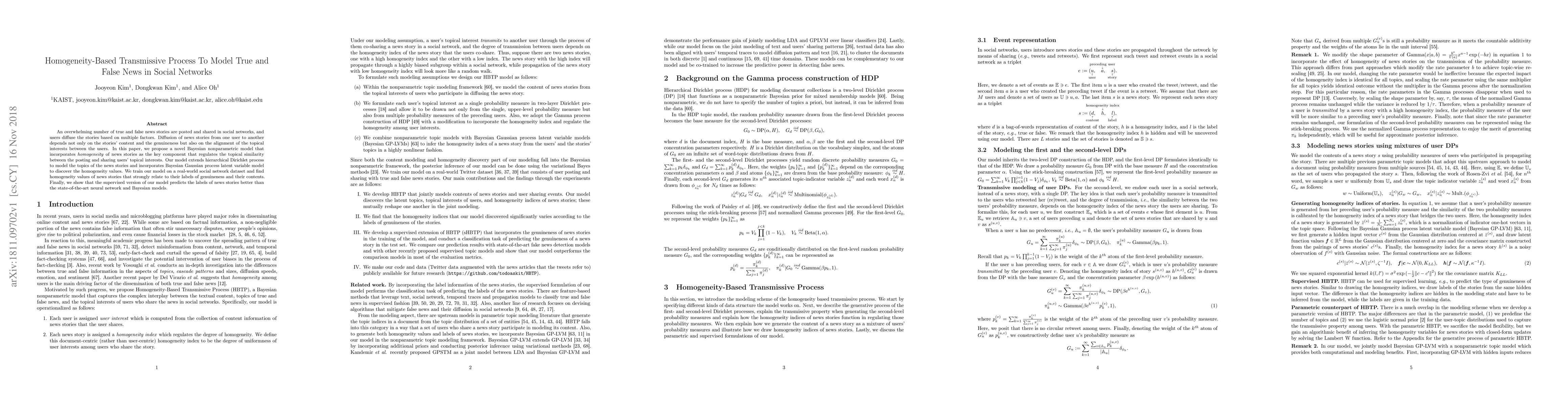 This paper proposes a Bayesian nonparametric model to distinguish true and false news in social networks, focusing on the homogeneity of news stories to reflect topical similarity between users. The model outperforms existing neural and Bayesian models in predicting news genuineness.