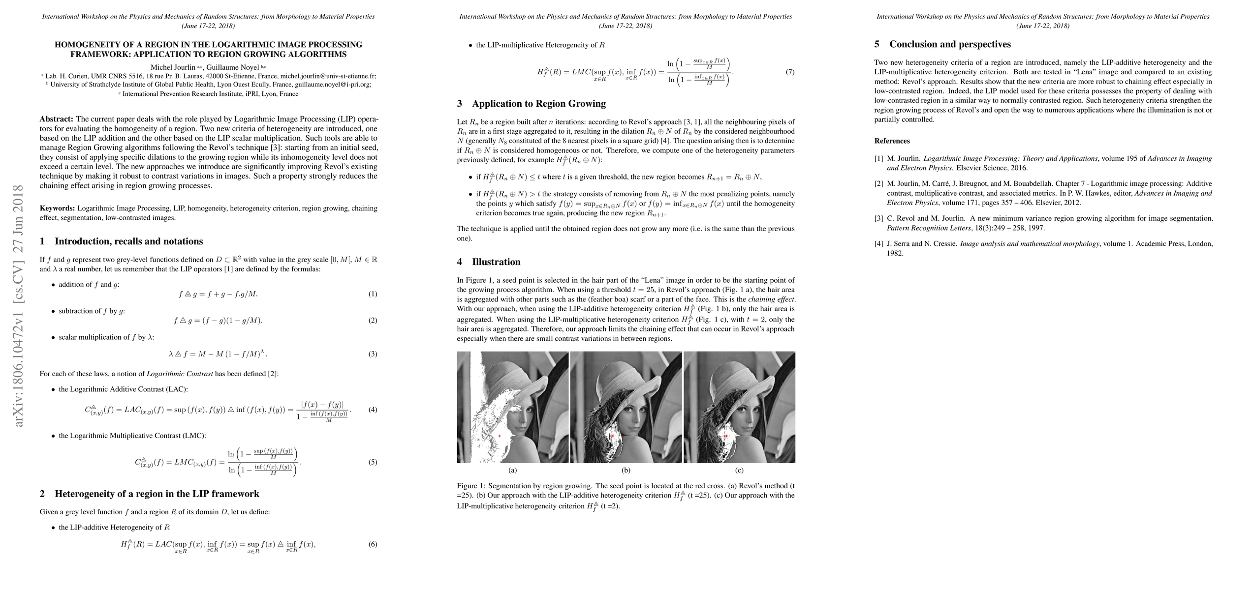 This paper introduces new criteria for evaluating region homogeneity using Logarithmic Image Processing (LIP) operators, enhancing Region Growing algorithms by improving robustness to contrast variations. The new methods reduce the chaining effect in region growing processes.