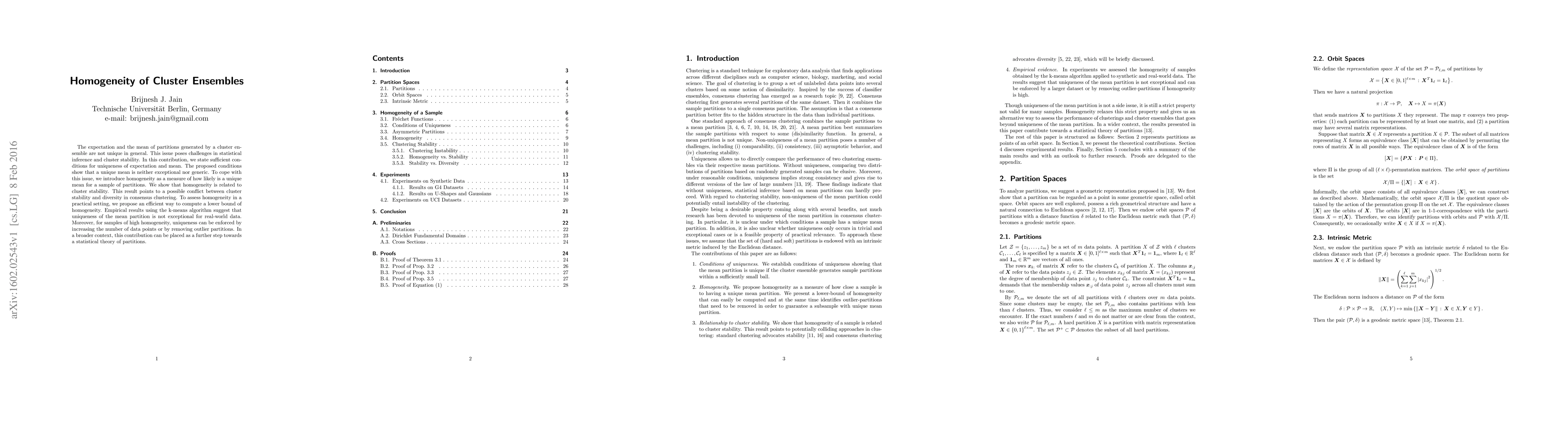 The expectation and the mean of partitions generated by a cluster ensemble are not unique in general. This issue poses challenges in statistical inference and cluster stability. In this contribution, we state sufficient conditions for uniqueness of expectation and mean. The proposed conditions show that a unique mean is neither exceptional nor generic. To cope with this issue, we introduce homogeneity as a measure of how likely is a unique mean for a sample of partitions. We show that homogeneity is related to cluster stability. This result points to a possible conflict between cluster stability and diversity in consensus clustering. To assess homogeneity in a practical setting, we propose an efficient way to compute a lower bound of homogeneity. Empirical results using the k-means algorithm suggest that uniqueness of the mean partition is not exceptional for real-world data. Moreover, for samples of high homogeneity, uniqueness can be enforced by increasing the number of data points or by removing outlier partitions. In a broader context, this contribution can be placed as a further step towards a statistical theory of partitions.