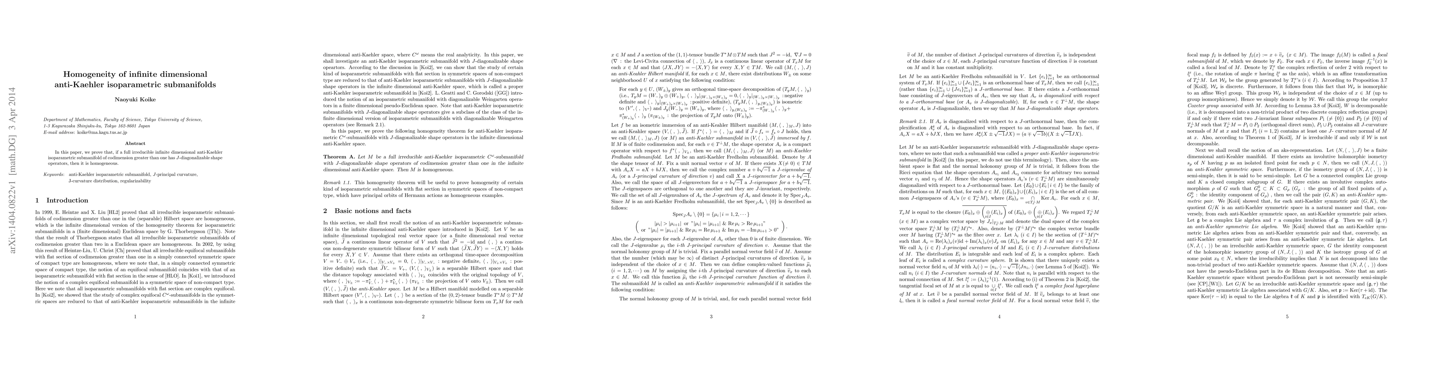 A full irreducible infinite dimensional anti-Kaehler isoparametric submanifold with diagonalizable shape operators is proven to be homogeneous if it has codimension greater than one.