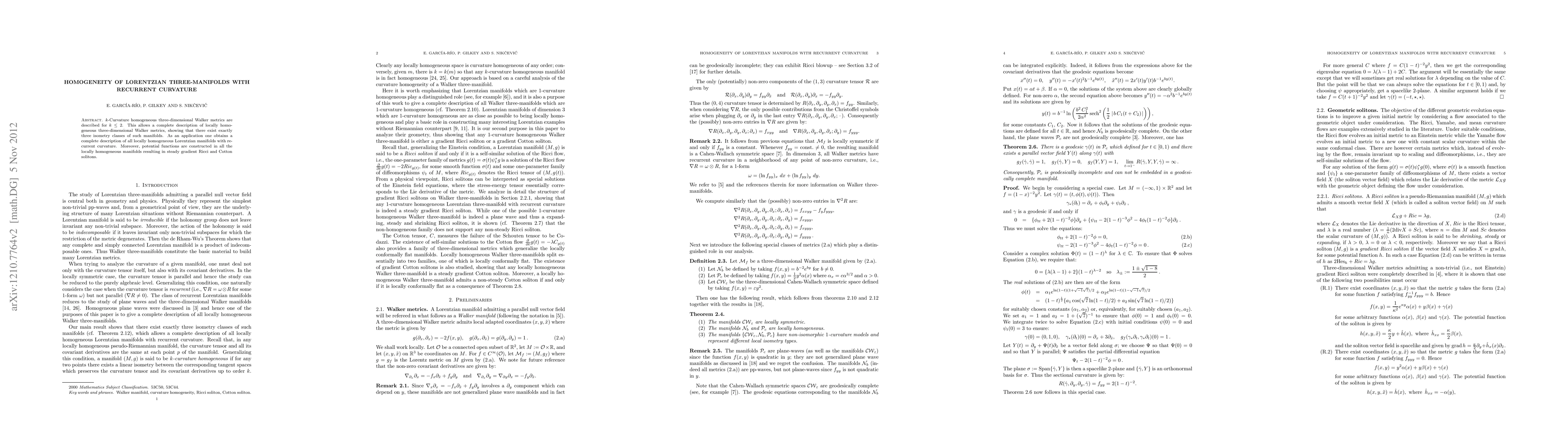 This paper classifies k-curvature homogeneous three-dimensional Walker metrics for k=0,1,2, revealing three distinct isometry classes of locally homogeneous manifolds. It also provides a complete description of locally homogeneous Lorentzian manifolds with recurrent curvature and constructs potential functions leading to steady gradient Ricci and Cotton solitons.