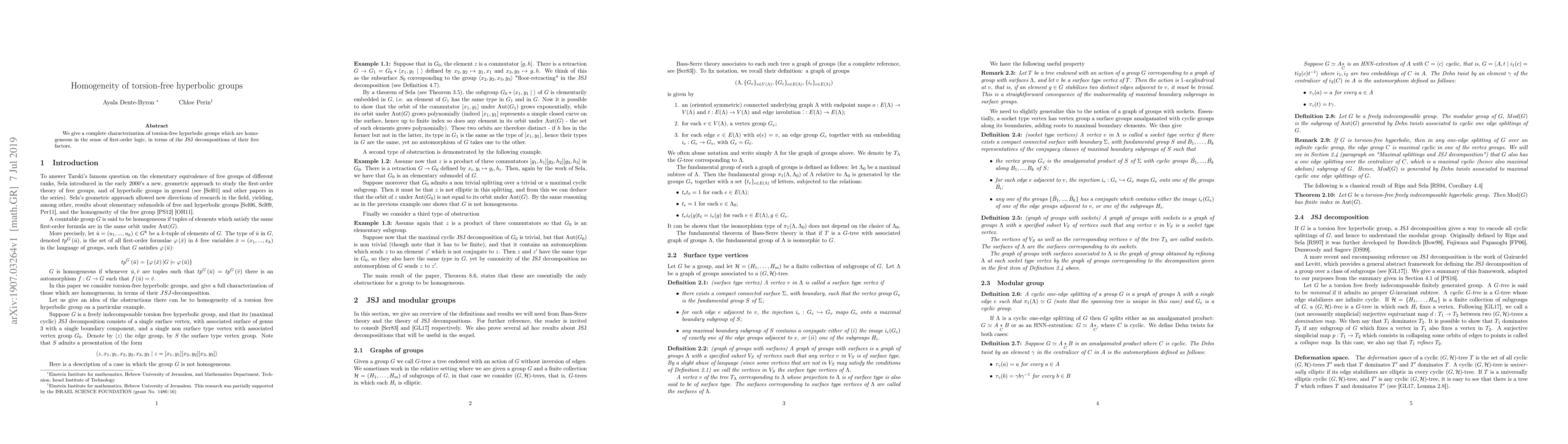 This paper provides a full description of torsion-free hyperbolic groups that are homogeneous in first-order logic, linking their properties to the JSJ decompositions of their free factors. The study reveals the structural characteristics that ensure logical homogeneity within these groups.