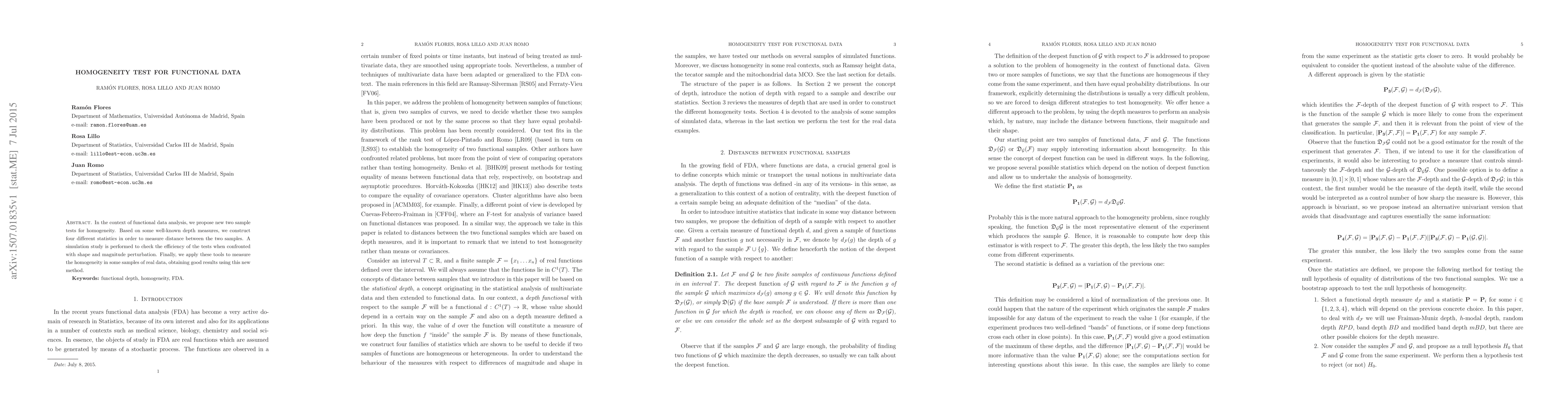 This paper proposes new two-sample tests for homogeneity in functional data analysis using depth measures, and evaluates their efficiency through simulations and real data applications. The results show promising performance in detecting differences in both shape and magnitude.