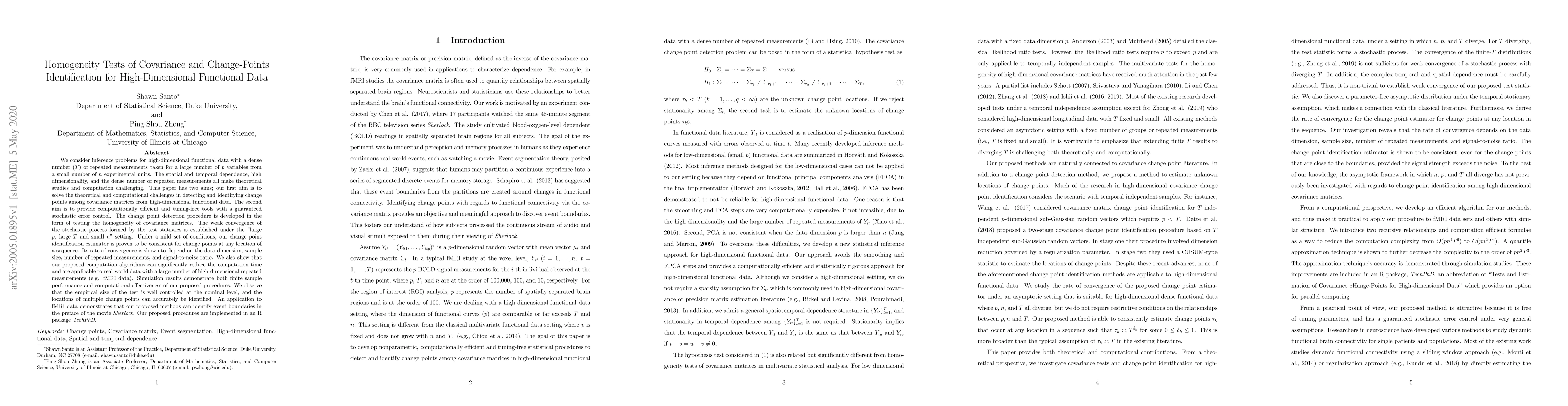 We consider inference problems for high-dimensional (HD) functional data with a dense number (T) of repeated measurements taken for a large number of p variables from a small number of n experimental units. The spatial and temporal dependence, high dimensionality, and the dense number of repeated measurements all make theoretical studies and computation challenging. This paper has two aims; our first aim is to solve the theoretical and computational challenges in detecting and identifying change points among covariance matrices from HD functional data. The second aim is to provide computationally efficient and tuning-free tools with a guaranteed stochastic error control. The change point detection procedure is developed in the form of testing the homogeneity of covariance matrices. The weak convergence of the stochastic process formed by the test statistics is established under the "large p, large T and small n" setting. Under a mild set of conditions, our change point identification estimator is proven to be consistent for change points in any location of a sequence. Its rate of convergence depends on the data dimension, sample size, number of repeated measurements, and signal-to-noise ratio. We also show that our proposed computation algorithms can significantly reduce the computation time and are applicable to real-world data such as fMRI data with a large number of HD repeated measurements. Simulation results demonstrate both finite sample performance and computational effectiveness of our proposed procedures. We observe that the empirical size of the test is well controlled at the nominal level, and the locations of multiple change points can accurately be identified. An application to fMRI data demonstrates that our proposed methods can identify event boundaries in the preface of the movie Sherlock. Our proposed procedures are implemented in an R package TechPhD.