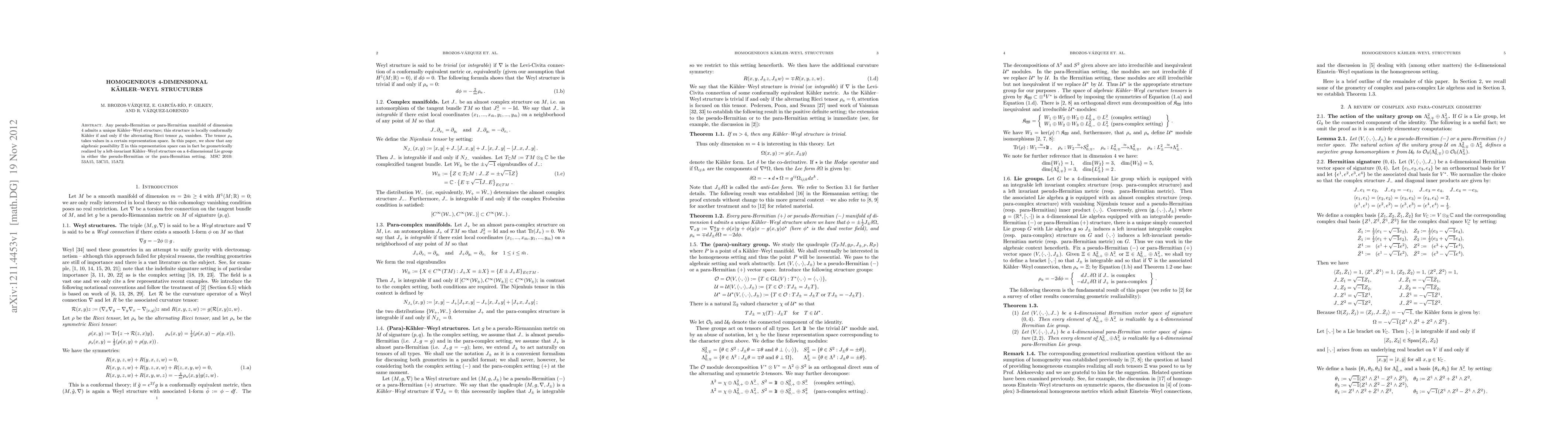 A 4-dimensional manifold can have a unique Kaehler-Weyl structure that is locally conformally Kaehler if the alternating Ricci tensor vanishes. Any algebraic possibility in the representation space of this tensor can be geometrically realized by a left-invariant Kaehler-Weyl structure on a 4-dimensional Lie group.